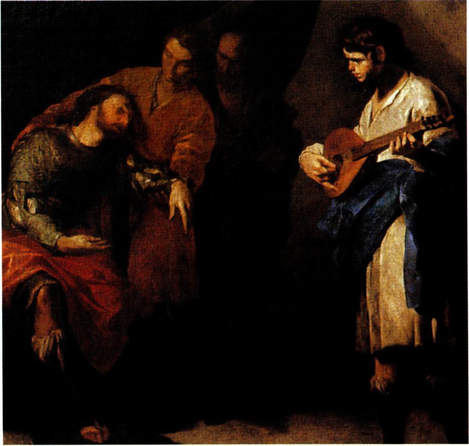 수금으로 사울의 조울증을 치료해 주는 다윗(라이덴 작) .