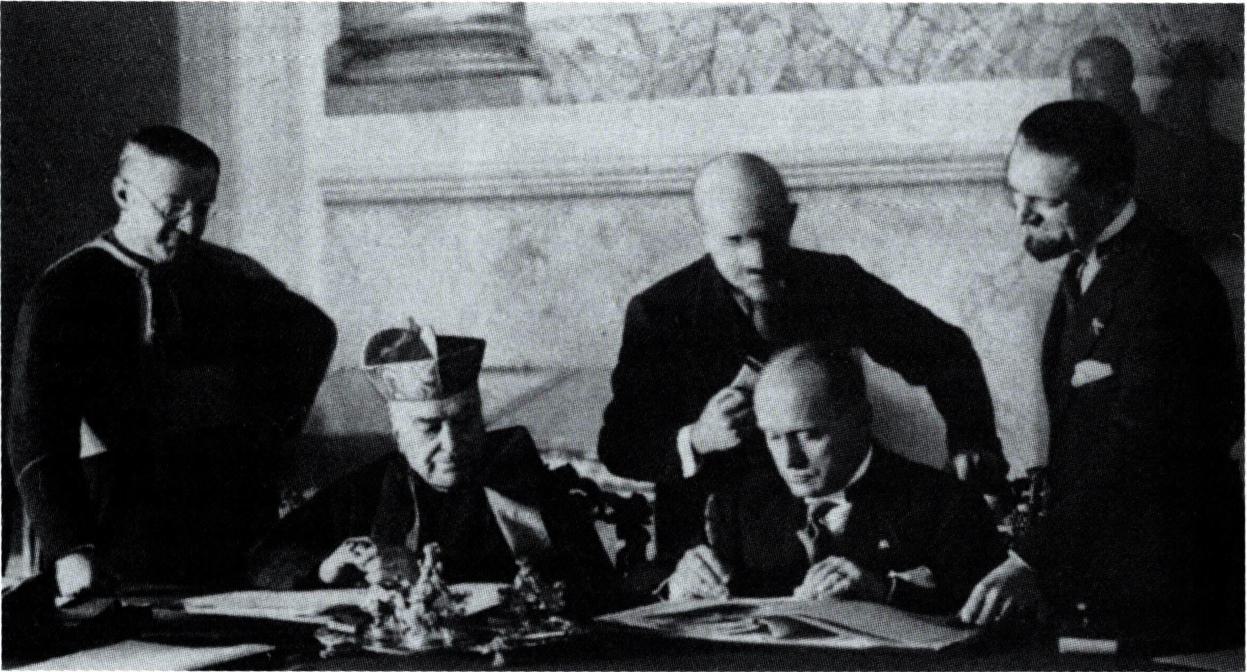 라테란 조약에 서명하는 교황청 국무성 장관 가스파리 추기경과 이탈리아 정부의 무솔리니 수상.