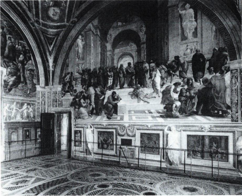 르네상스가 성숙해져 가면서 메디치 가(家)에 의해 키워진 귀족적인 취미는 16세기에 들어와 교황을 중심으로 한 궁정적인 호화로움을 더해 갔다. 당시의 로마 교회는 중세 교회와는 달리 그리스적인 이상과의 조화를 추구하고 있었다. 라파엘로는 이러한 교황청을 중심으로한, 귀족과 궁정 취미에 잘 부합하였다. 그가 그린 우아한 성모 마리아상은 교회와 일반인들 모두로부터 대단한 칭찬을 받았으며, 이후 성모화의 하나의 전형으로 오랫동안 받아들여졌다. 또한 대표작인 <아테네 학당>에서 보듯, 여러 인물들을 한화면에 구성하는 데에 능숙하였다. 전성기 르네상스의 고전적인 정신을 완전하게 구현한 걸작으로 평가되는 이 작품은 라파엘로가 바티칸 궁전 '서명의 방' 에 그린 벽화 중의 하나로 주제는 '아테네 학파' , 즉 유명한 그리스 철학자의 군상이다. 반원형 구도 안에 플라톤, 아리스토텔레스를 비롯하여 소크라테스, 헤라클레이토스 등 고대 철학자와 과학자들을 그린것으로 그 당시의 신플라톤주의의 사상을 조형적으로 표현한 걸작이다. 한편 라파엘로는 이 작품 구석에 자신의 자화상과 단테, 레오나르도 다 빈치를 그려 넣었다. 건장한 인체의 표현이나 극적인 군상의 구성은 분명 미켈란젤로의 영향이다. 라파엘로는 이 작품을 제작할 당시 거의 완성 단계에 있던 미켈란젤로의 시스티나 천장화를 보았음에 틀림없다. 그러나 그는 미켈란젤로의 인물의 자세나 동작을 그대로 차용하지 않고, 자신의 양식에 동화시켜 다른 의미를 부여하였다.