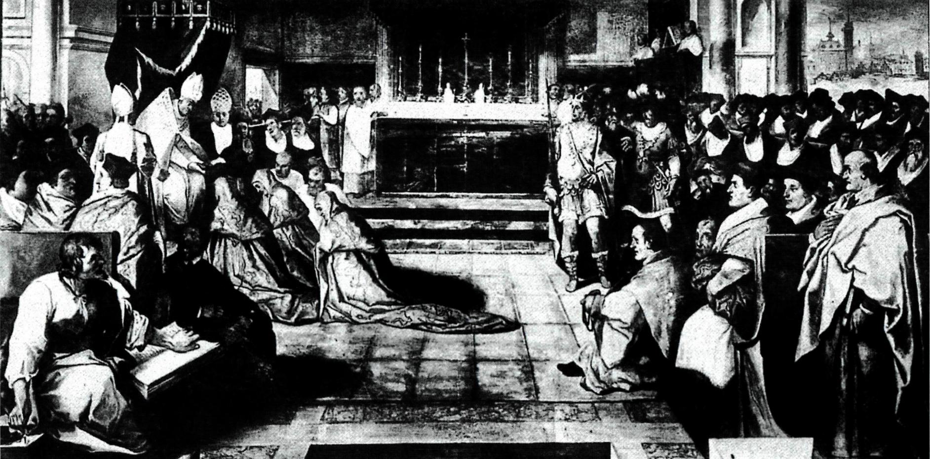 프리드리히 2세 황제가 제1차 리용 공의회에 파견한 사절들을 맞이하는 인노첸시오 4세 교황.