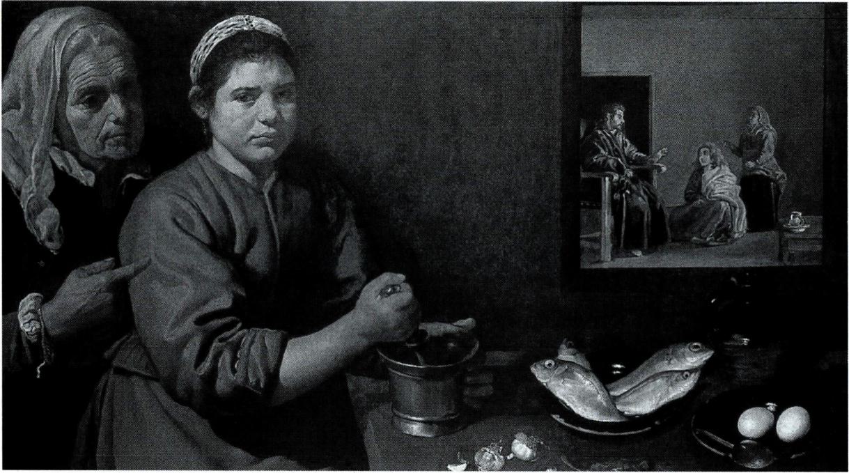 마리아가 예수의 발치에 앉아 말씀만 듣고 있는 것에 대해 불평하는 마르타(벨라스케즈 작) .