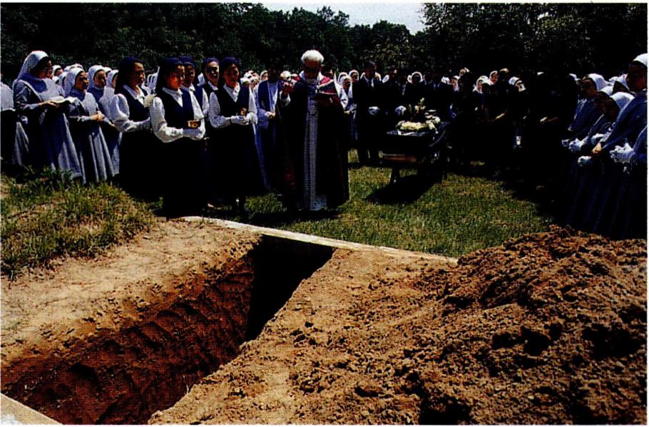 교회법의 규정 : 현 교회법은 "교회는 죽은 이들의 몸을 땅에 묻는 경건한 관습을 보존하기를 간곡히 권장한다. 그러나 화장을 금지하지 아니한다. 다만 그리스도교의 교리에 반대하는 이유들 때문에 선택하였으면 그러하지 아니하다"(1176조 3항)라고 규정하고 있다. 이러한 규정은 육신 부활의 교리에 그 토대를 두고 있는데, 육신은 영혼과 더불어 천국에서 영원히 행복을 누리고 영예와 존경을 받아야 한다는 것이다. 그렇기 때문에, 적절하고 안전한 장소에 매장되는 것이 바람직하다는 입장에서 "본당 사목구가 고유한 묘지를 가지고 있으면 죽은 신자들은 그 곳에 매장되어야 한다. 다만 사망자 본인이나 또는 사망자의 매장을 돌보는 이들이 다른 묘지를 합법적으로 선택하였으면 그러하지 아니하다"(1180조 1항)라고 규정하였다. 오랜 시기 동안 변함없이 이어진 교회의 매장 방식은 교회의 예식, 즉 전례법의 규범에 따라 거행(1176조 2항)되어야 하는데, 전통적으로 세 부분으로 이루어져 있다. 첫째 부분은 밤샘 기도 · 염습 · 입관 등 죽은 이의 집에서 하는 예식이며, 둘째 부분은 장례 미사 ·고별식 등 성당에서 하는 예식이며, 셋째 부분은 묘지로 가는 행렬 · 무덤 축복 · 하관 등 묘지에서 하는 예식이다. (→ 교회 묘지 ; 장례 미사 ; 부활 ; 화장)