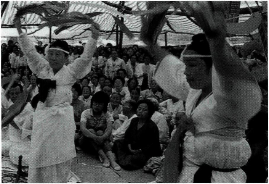 〔유 형〕 무당의 유형은 크게 강신무(降神巫)와 세습무(世襲巫)로 나눌 수 있다. 우리 나라 중부 지역과 북부 지역에 많이 분포하고 있는 강신무는 신의(神意)에 따른 강신 체험을 통해 영력을 획득하여 점을 치고 미래를 예언하며, 제의에서는 사제인 동시에 그 몸에 신이 실려서 신격화하는데 공수(또는 신탁)를 통해 신의 뜻을 자신의 육성으로 전한다. 강신무는 굿거리마다 그 거리에 해당되는 신으로 현현하므로 무복(巫服)은 각 제차(祭次)마다 개별신을 상징하는 옷이 있어 보통 12~20종에 이른다. 제의에 사용되는 무구(巫具)로는 타악기가 위주이며 가무의 가락과 속도가 몹시 빠르고 흥분된 도무(跳舞)가 따른다.