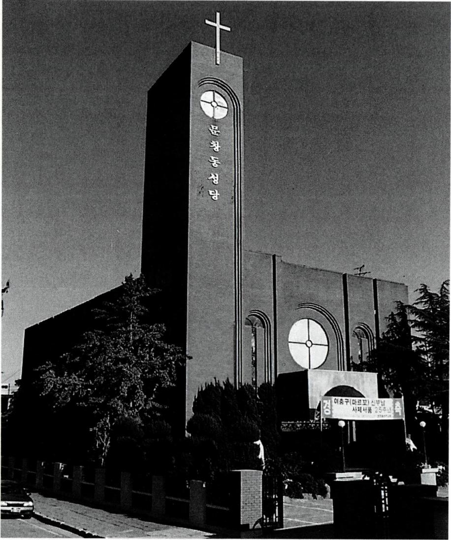 한편 20년 간 사용해 온 성당은 기둥을 높이 세운 구 조로 되어 있었기 때문에 보수 공사 때마다 어려움이 많 았고 재정적인 부담도 커 8대 우희수 신부는 성당을 새 로 건립하기로 결정하였다. 이에 따라 1987년 2월 성가 유치원을 폐원하고 유치원 건물에서 미사를 봉헌하는 한 편, 같은 해 4월 19일 신축 공사에 착수하여 1년 7개월 만인 1988년 11월 17일 연건평 455평에 지하 1층, 지 상 3층 규모의 성당을 완공하였다. 이후 환기 장치가 설 치되지 않아 불편을 겪어 왔던 사제관을 헐고 1994년 7 월 22일 그 자리에 새로 사제관(76평)을 건립하였다. 문 창동 본당은 이처럼 대전 지역 안에서는 비교적 오랜 역 사를 지니고 있지만, 대전시 외곽에 위치해 있고 개발 지 역도 아니기 때문에 도심 아파트 단지로의 이주 인구 증 가로 1988년 이후부터 신자수 감소 추세가 두드러지게 나타나고 있다. 그리하여 최근에는 신심과 친교 활동에 주력하면서 예비자수를 점진적으로 늘일 수 있는 대책 방안 마련에 고심하고 있다. (→ 대전교구)