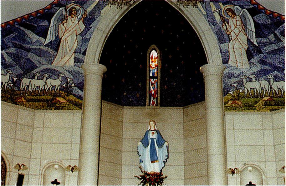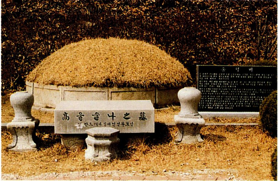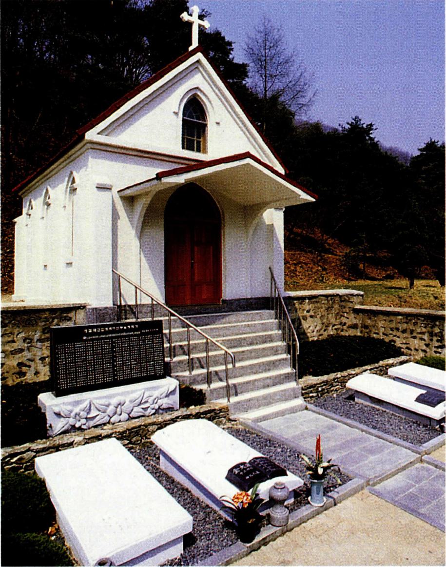 이와 함께 본래 무덤이 있던 자리에는 1928년에 김대 건 신부의 경당이 건립되었다. 당시 미리내 본당의 주임 으로 있던 강도영(姜道永, 마르코) 신부는, 1925년 7월 5일 김대건 신부를 포함한 기해 · 병오박해 순교자 79위 에 대한 시복식이 있기 전해에 이 소식을 듣고는 여러 성 직자와 교우들의 협조를 얻어 본래 무덤이 있던 자리에 기념 경당을 건립하기로 하였다. 그리고 1928년 봄에 이를 착공하여 같은 해 7월에 준공하였으며, 9월 18일 에는 라리보(Laribeau, 元亨根) 주교의 집전으로 '치명자 의 모후' 를 주보로 축성식을 갖게 되었다. 이 경당의 길 이는 8m, 너비는 4m로, 경당과 무덤 둘레에는 2m 높이의 담이, 정면 중앙에는 당문(堂門)이 있다.