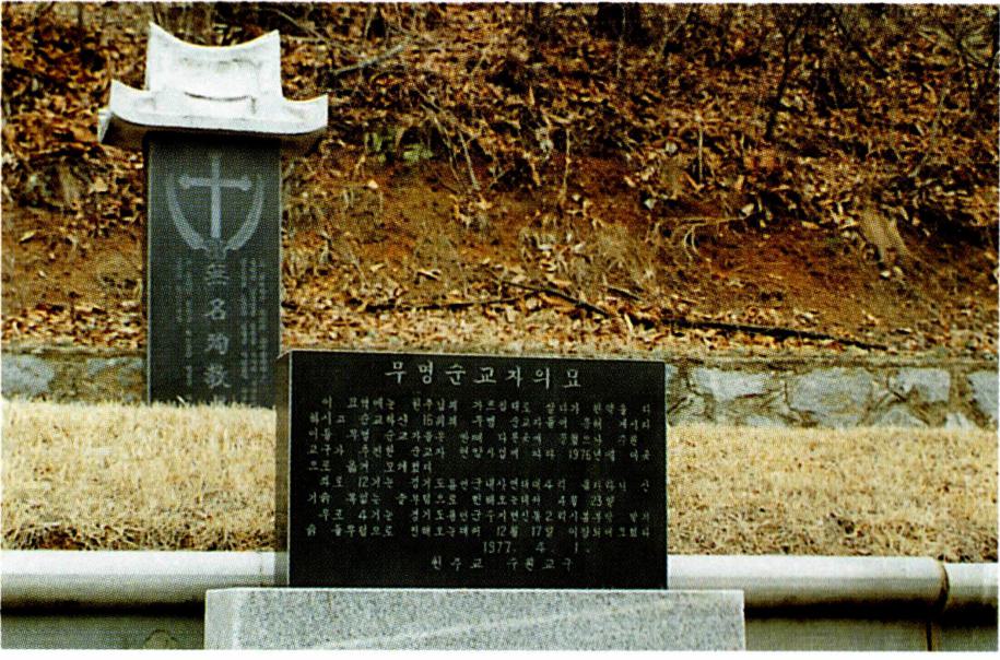 한편 이윤일(요한) 성인과 미리내 사적지가 관련을 맺 게 된 것은 1976년이었다. 본래 충청도 홍주 출신인 그 는 박해를 피하여 경상도 상주 땅에서 은거하며 살다가 1866년의 병인박해 때 체포되어 대구 감영으로 이송되 었고, 1867년 1월 21일(음 1866년 12월 26일) 관덕당(觀 德堂, 대구시 중구 남산2동)에서 순교하였다. 순교 후 그의 시신은 형장 부근에 가매장되었다가 3월경에 그의 두 아 들과 매부 이응칠(토마스), 마티아 형제 등에 의해 날뫼 (대구시 비산동)로 이장되었으며, 1901년부터 경부선 철 도 공사가 시작되면서 아우인 이시영에 의해 용인 먹방 이(용인군 이동면 묵리)로 다시 이장되었다. 먹방이의 순교 자 무덤은 이때부터 '거꾸로 무덤' 으로 불리면서 구전으 로 전해져 오다가 1976년 6월 24일, 미리내의 수원교구 성직자 묘역 내에 조성된 무명 순교자 묘역으로 옮겨져 안장되었다. 그리고 이윤일이 성인으로 시성된 지 2년 뒤인 1986년 12월 20일 대구대교구 발굴단에 의해 대 구 관덕당 기념관으로 옮겨지게 되었다.