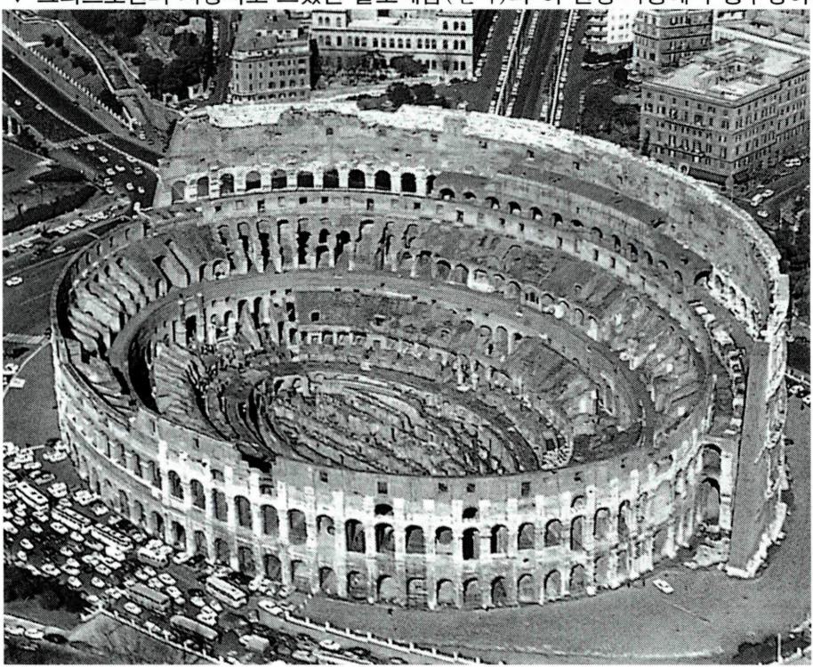 그리스도인의 처형지로 쓰였던 콜로세움(왼쪽)과 이 원형 극장에서 맹수형이나 화형을 당하는 그리스도인들.