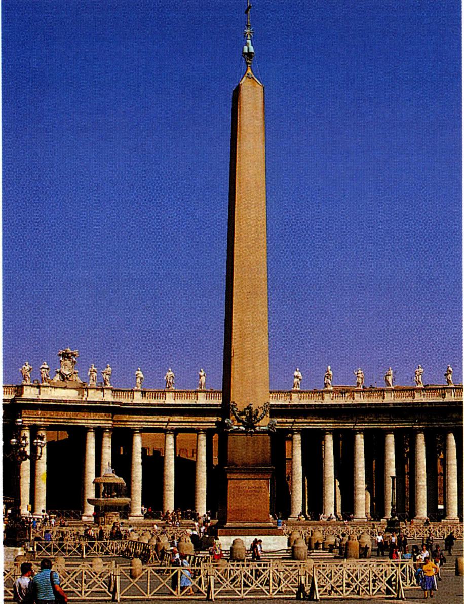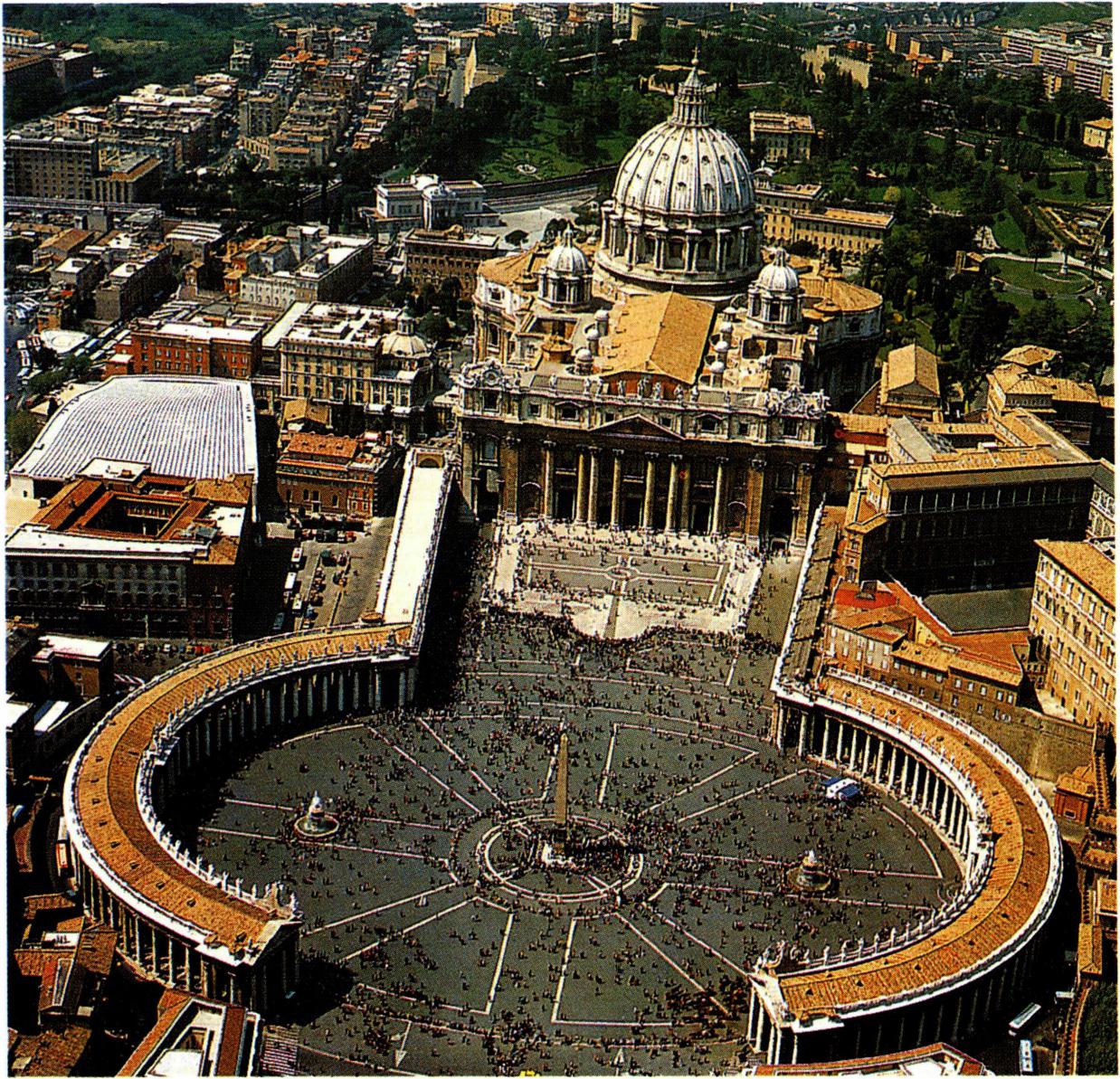 베드로 대성전은 최대 길이 221m, 최고 높이 141m로 세계 최대의 성당 가운데 하나이며, 독창적인 구상과 중앙의 거대한 돔 양식은 인류가 이룩한 가장 위대한 창조물의 하나로 평가되고 있다. 미켈란젤로가 예수 그리스도의 가시관을 상징하여 제작한 돔의 직경은 42m나 되며, 돌출한 부벽(扶壁)에 둘씩 짝을 지은 코린트식 기둥이 조화 있게 배치된 이 돔의 내부는 성화로 장식되어 있는데 아름다움의 극치를 이루고 있다. 대성전 앞의 타원형 대광장 중앙에는 로마 제국의 칼리굴라 황제(37~41)가 이집트에서 가져와 사도 베드로가 처형된 원형 경기장에 세웠던 오벨리스크(obelisk)가 교황 식스토 5세(1585~1590)에 의해 이곳으로 옮겨져 있다. 이 오벨리스크는 높이 25.88m로, 청동 사자 4마리의 호위를 받고 있으며, 맨 위에 십자가가 있고, 그 아래에는 교황 알렉산데르 7세의 가문 문장이 장식되어 있다. 오벨리스크와 회랑 사이에는 분수대가 있으며, 오벨리스크를 중심으로한 타원형 광장과 성당의 전면은 사다리꼴의 광장으로 연결되어 있다. 광장 둘레에는 벽이 없는 두 겹의 열주가 둘러져 있고, 그 주랑 위에는 높이 약 3.6m에 이르는 140명의 성인 입상이 세워져 있다.
