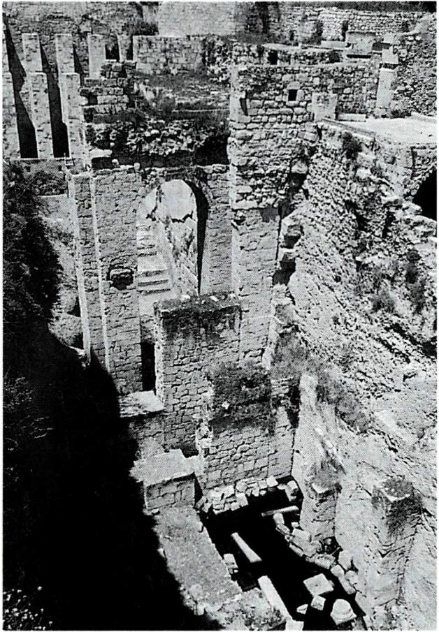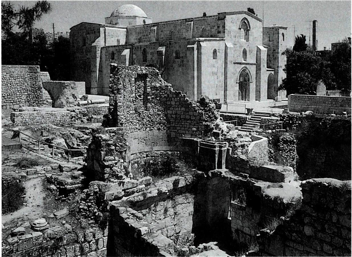 성 안나 성당 후원 서쪽에 있는 베짜타 연못(왼쪽)과 비잔틴 시대와 십자군 시대에 만들어진 주랑들의 흔적.