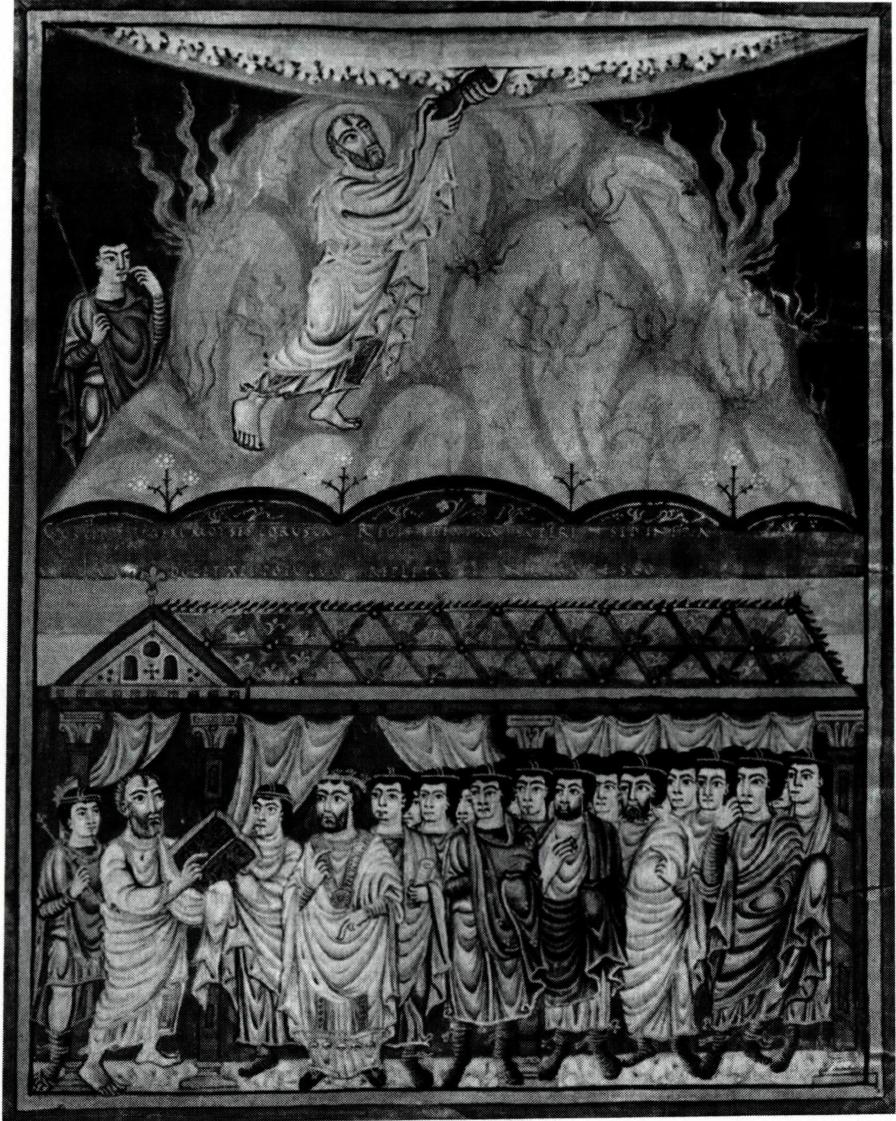 십계명을 받은 모세가 이스라엘 백성들에게 읽어 주고 있다.