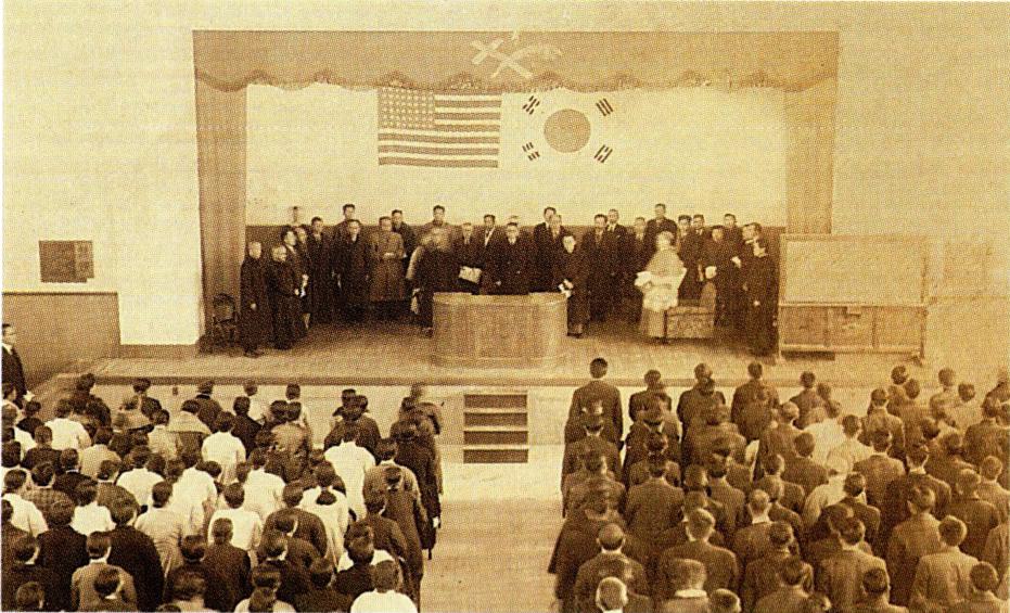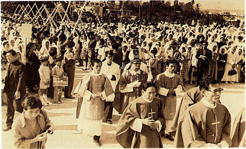 1924년 9월 21일 경성교구 천주교 청년 연합회 창립 총회에 참석한 각 지방 대표들(왼쪽)과 1931년 9월 31일의 전 조선 주교 회의 개막 미사 후의 퇴장 행렬
