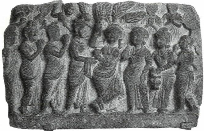 석가모니의 생애를 묘사한 불전 조각. (왼쪽부터) 탄생, 관수(灌水), 열반.