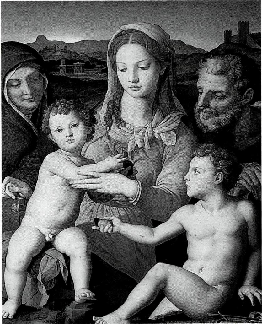 중세기의 화가들은 예수 그리스도의 생애에 대한 묵상 을 통해 그림을 그렸는데, 즉 이집트에서 돌아온 성가정 이 엘리사벳의 집에 머물렀을 때 어린 예수와 세례자 요 한이 함께 노는 모습을 표현하기도 하였고, 마리아가 그 녀의 어머니 성녀 안나의 무릎에 앉아서 자신의 무릎 위 에 아기 예수를 받치고 있는 모습을 그리기도 하였다. 중 세 시대의 성화 중 일반적인 형태를 띤 대표적인 작품으 로는 루브르 박물관에 소장되어 있는 레오나르도 다 빈 치(Leonardo da Vinci, 1452~1519)의 그림을 들 수 있는데, 그는 전통적인 성가정 성화의 기법을 그대로 이어받고 있다. 다 빈치의 <성모 마리아, 아기 예수와 성녀 안나> (La Vierge, L'Enfant Jésus et sainte Anne, 1510)는 성녀 안나 의 무릎 위에 앉아 있는 마리아가 아직 희생의 시간이 다 가오지 않았음을 의미하듯 어린 양과 놀고 있는 아기 예 수를 품으로 끌어당기는 모습을 그린 작품이다. 브론치 노(Bronzino, 1503~1572)의 <세례자 성 요한과 성녀 안나 와 함께 있는 성가정>(La Sainte Famille avec saint Jean et sainte Anne, 1540, 루브르 박물관 소장) 역시 유명한 작품인 데, 여기에는 세례자 요한과 함께 놀고 있는 아기 예수를 중심으로 마리아와 그녀의 어머니 성녀 안나와 성 요셉 이 나란히 밀착하여 배치되어 있다. 성녀 안나가 함께 등 장하는 성가정 성화는 독일에서 가장 널리 전파되었으