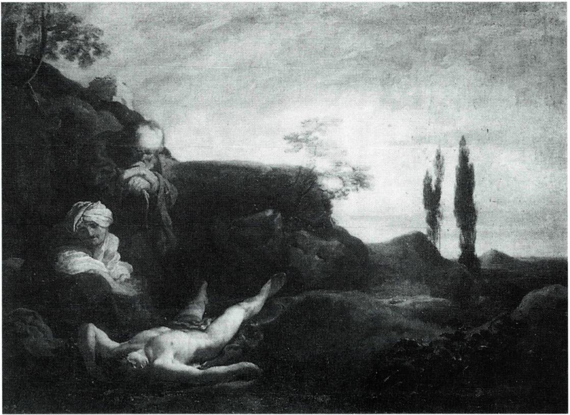 야훼께 양의 맏배를 봉헌하는 아벨(왼쪽)과 그의 죽음을 슬퍼하는 아담과 하와.
