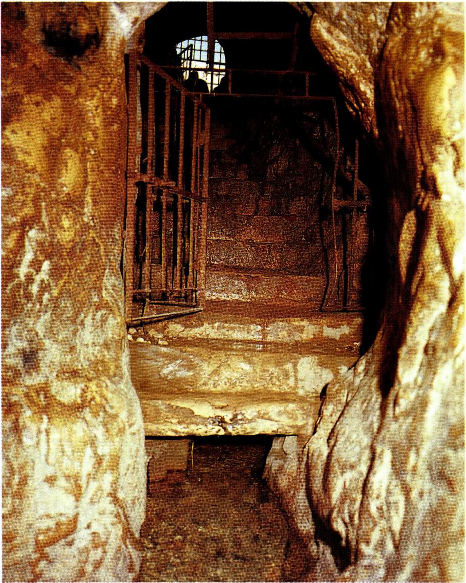 지하 급수 시설 : 예루살렘의 지하 급수 시설은 유일 한 수원지인 키드론 골짜기의 기혼 샘의 물을 최대한 효 율적으로 이용할 수 있도록 고안된 워런 수직 통로, 실로 암 수로, 그리고 히즈키야 터널 등 모두 3종류가 있다. 워런 수직 통로는 1867년 예루살렘 탐사 임무를 수행하 던 영국 공병대의 워런(C. Warren)이 처음 발견했다. 전 체 구조는 지상에서 54m 길이의 경사진 터널을 통해서 밑으로 내려간 다음 마치 우물에서 물을 긷는 것처럼 12.3m 높이의 수직 통로는 기혼 샘의 물길과 연결되어 있다. 지질학적인 조사 결과 워런 수직 통로는 원래 파여 진 자연 동굴과 바위 틈을 이용해서 만든 것으로 밝혀졌 다. 성서학자들은 워런 수직 통로가 요압이 예루살렘을 점령할 때 타고 올라갔던 '지하 수로' 라고 해석하기도 한다(2사무 5, 8 : 1역대 11, 6). 하지만 이스라엘의 다른 도시들(므기또 · 하솔 · 게셀 · 기브온 · 이블르암)의 경우처럼 워런 수직 통로는 다윗 시대 이후에 건설된 것으로 보인 다.