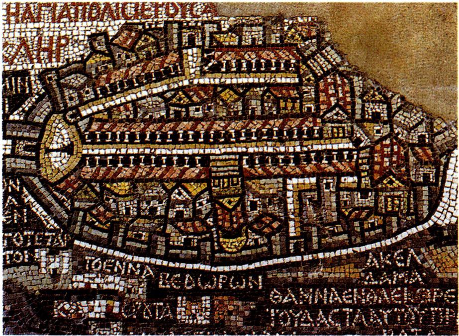 예루살렘의 남쪽 끝 카르도에 인접해 있었다. 오늘날 네 아 성당의 일부는 오물 성문에서 시온 성문에 이르는 성 벽 부분에서 찾아볼 수 있다. 비잔틴 시대에 예루살렘은 전체 길이가 4.5km에 달하는 성벽으로 둘러싸여 있었으 며, 마다바 모자이크 지도에 의하면 모두 20개의 망루가 성벽에 건설되었고 6개의 성문이 있었던 것으로 추정된 다. 로마 10군단 진지 때문에 막혔던 카르도는 남쪽으로 연장되었고, 특히 이 중 일부는 오늘날 유대인 구역 내에 서 발굴되어 복원된 상태로 잘 보존되어 있다. 비잔틴 시 대의 그리스도교인들은 유대인들의 성전 파괴를 본보기 로 후세에 남겨 두기 위해 성전 산은 폐허가 된 채로 방 치해 두었다. 이 시대에 예루살렘에 건설된 대표적인 성 당은 성벽 안의 경우 골고타의 예수 부활 기념 성당을 비 롯해 네아 성당, 베데스타의 성 마리아 성당, 거룩한 시 온 성당, 실로암 성당 등이다. 성벽 밖에는 올리브 산 정 상의 승천 성당을 비롯해서 올리브 정원 성당, 도미누스 플레빗 성당, 게쎄마니 성당, 마리아 무덤 성당, 성 스테 파노 성당 등이 건설되었다. 비잔틴 시대 전성기의 예루 살렘의 면적은 180만 ㎡에 달했고 인구는 8만 명 이상 으로 추산된다.