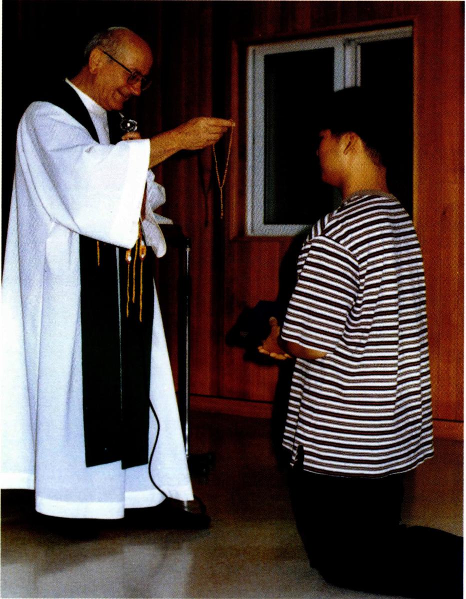 한국 진출 초기에 전북 고창 동혜 마을에서 나환후 가족들(왼쪽)과 동혜원 공소를 방문한 총장 신부와 신자들.