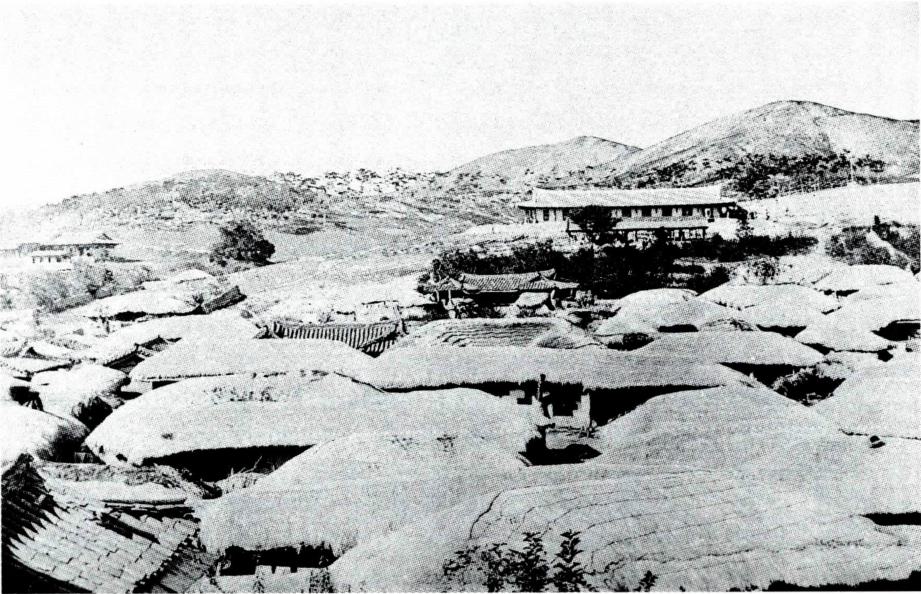 초가집들 사이로 멀리 보이는 기와집이 재령 본당이다(1901. 9월경, 왼쪽). 본당 사제관(1899. 5~ 1901까지 사용)앞에서 신자들과 함께 서 있는 르각 신부.