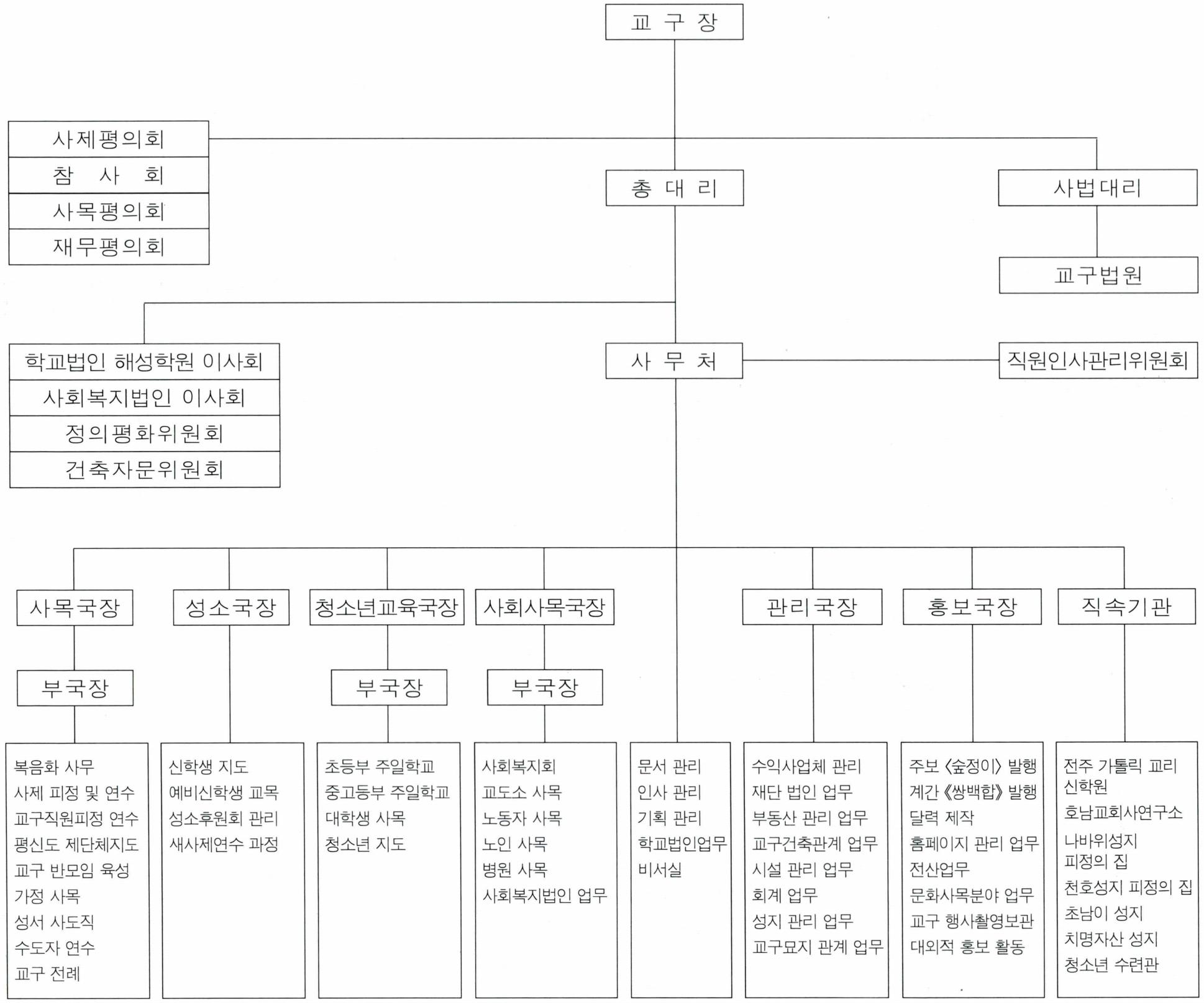현재 전주교구는 동전주 지구, 서전주 지구, 남전주 지구, 북전주 지구, 군산 지구, 익산남 지구, 익산북 지구,김제 · 정읍 · 고창 · 부안 지구, 임순남무진장(임실 · 순창 · 남원 · 무주 · 진안 · 장수) 지구, 특수 지구의 10개 지구로 구성되어 있고, 평신도 사도직 단체 34개와 수도 단체 24개가 활동하고 있다. 교구 주보(週報)는 <숲정이>이며, 공소용 <주님의 날>과 어린이용 <어린 양>을, 그리고 2003년에는 계간지로 《쌍백합》을 발간하고 있다.2003년 현재 본당 84개, 교우수 161,194명, 사제 166명, 공소 108개이다. (→ 강경포 사건 ; 권상연 ; 신사참배 ; 신해 박해 ; 유항검 ; 윤지충)