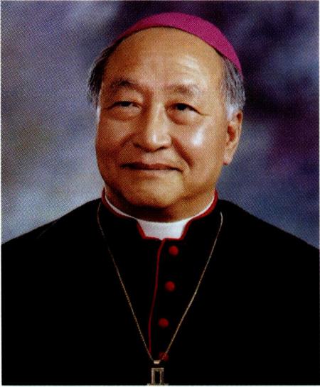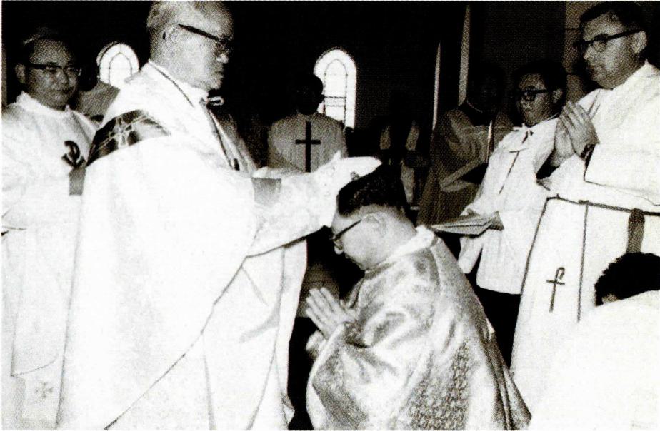 주교 서품식 중 노기남 대주교로부터 안수를 받는 정진석 주교.