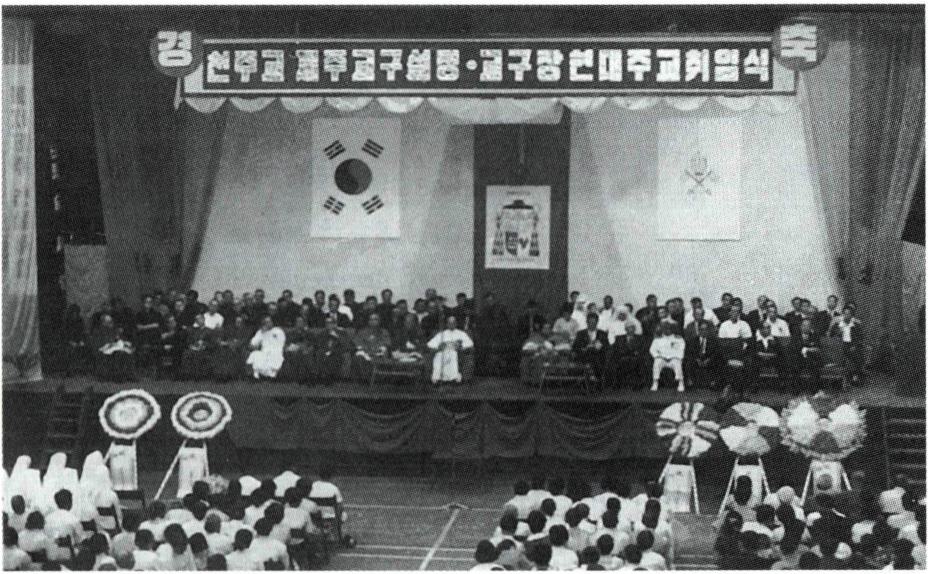 에 선종하면서 제주 지목구장은 일시 공석이 되었다. 그러자 교황청에서는 1977년 3월 21일 제주 지목구를 '제주교구' 로 승격시킴과 동시에 4월 15일 광주 대건신학대학(현 광주 가톨릭대학교) 교수로 재임하던 박정일 주교를 교구장으로 임명하였다. 이로써 제주 교회는 지목구 설정 5년 9개월 만에 새로운 변화를 맞이하게 되었다.