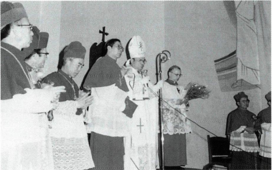 〔지목구 설정과 교구 승격〕 1970년 7월 헨리 대주교는 주교 회의의 승인을 얻어 제주교구 설정 요청서를 교황청에 제출하였다. 그러자 교황청에서는 이를 받아들여 1971년 6월 28일자로 제주 감목 대리구를 '제주 지목구 로 설정하는 동시에 광주대교구장 헨리 대주교를 지목구장에 임명하였다. 1899년 제주 본당이 설립된 지 72년 만이었고, 1956년 제주 감목 대리구가 설정된 지 15년 만이었다. 당시 제주의 교세 현황은 8개 본당, 24개의 공소에 신자수 11,920명, 성직자수 20명(한국인 6명, 외국인 14명)이었다. 지목구 설정 한 달 뒤인 7월 18일에는 제주 출신의 이태수(李泰壽) 미카엘 신부와 허승조(許勝照) 바오로 신부가 사제로 서품되었다.