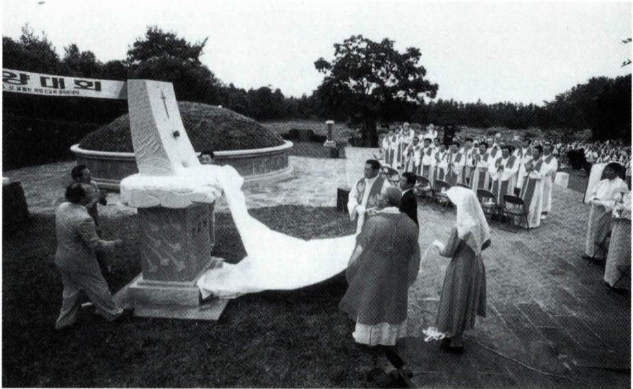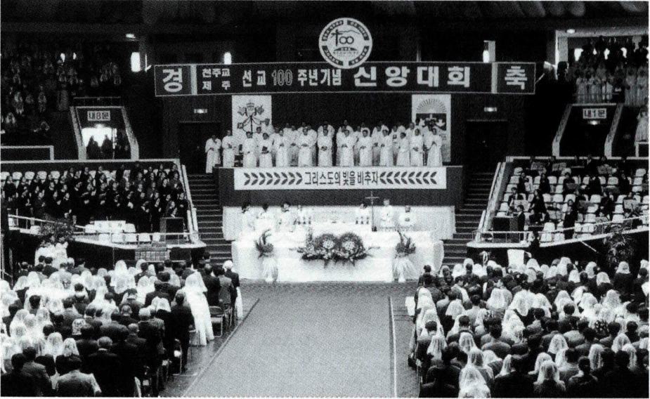 (2001년 12월 간행). 이어 5월 17일에는 교구 각 본당 합동 예비 신자 환영식을 열었고(3,172명 입교), 7월 31일 부터 3일 동안 청소년 신앙 대회를 성대하게 개최하였다. 100주년 기념 사업은 계속 이어져 1998년 9월 황사평에서 파리 외방전교회와 골롬반 외방선교회 선교사 공덕비, 순교자 김기량 순교비 제막식이 있었고, 1999년 7월에는 교구 성가 발표회가, 9월 19일에는 용수(龍水) 포구에서 '제주 선교 100주년 기념 순교자 현양대회 및 성지 선포식' 이 개최되었다. 이에 앞서 기념 사업 위원회에서는 성 김대건 신부가 용수 표착 시에 타고 온 라파엘(Raphael)호를 고증을 통해 복원하였다. 이 100주년 기념 사업과 행사들은 1999년 11월 21일에 개최된 신앙 대회를 끝으로 종결되었는데, 당시 교구의 신자수는 50,761명으로 지역 복음화율 9.4%를 기록하게 되었다.