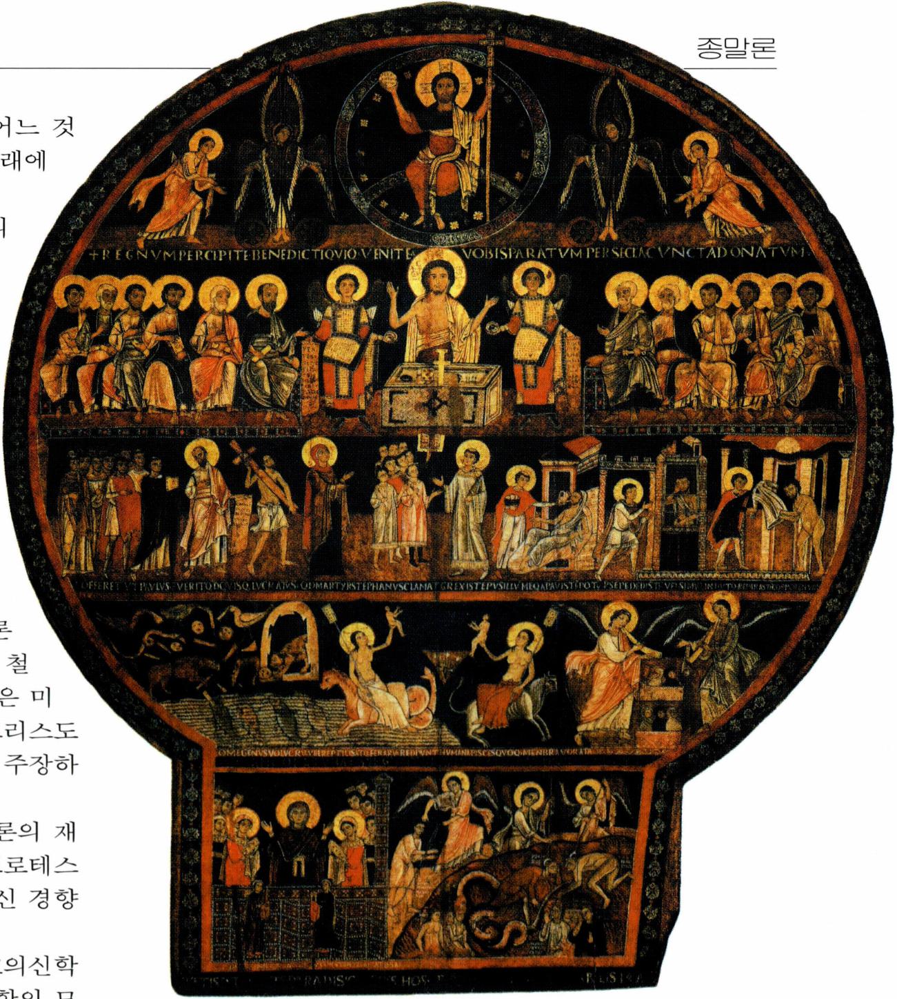 〔중세 교회〕 아우구스티노 이후 전통적 종말론은 골격 을 거의 갖추게 되어 신학의 마지막 분야로 정리되어 갔 다. 그래서 중세 시대 동안 초대 교회 때와 같은 종말론 적 유형이 계속된다. 토마스 아퀴나스(1224/1225~1274)는 《신학 대전》(Summa Theologiae) 끝 부분에서 종말론을 다 를 예정이었으나, 성사론 집필 도중에 세상을 떠남으로 써 그의 종말론은 미완성이 되었다. 그러나 다른 곳에서 종말론의 주요 주제인 '천당 영복' 과 '지옥 영벌' 의 본