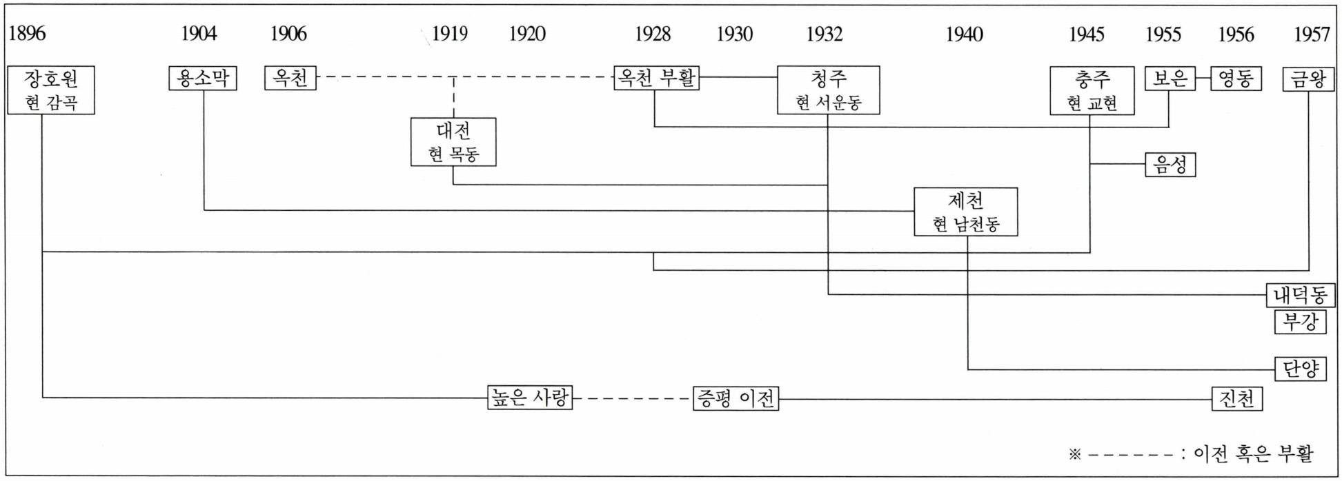 ※ 참고문헌 샤를르 달레, 안응렬 · 최석우 역주, 《한국 천주교회사》 상 · 중 · 하, 한국교회사연구소/ 《경향잡지》/ <가톨릭신문> 1 <평화신문>/ 《가톨릭대사전》 / 한국교회사연구소 소장, <본당별 교세 통계표>(필사본)/ 천주교 내덕동 교회, 《내덕 25년사》, 뒷목 출판사, 1982/ 한국교회사연구소 편, 《서 울大教區敎區總覽》, 가톨릭출판사, 1984/ 한국교회사연구소 역편, 《서울 教區年報》 I · Ⅱ, 명동 천주교회, 1984· 1987/ 옥천 본당사 편찬 위원회, 《옥천 본당사(상)》, 청주교구 옥천 본당, 1991/ 한국천주교중앙협의회, 《한국천주교회 연감》, 1994/ 청주교구, 《교구 연감》, 1995/ 천주교 교현동 교회, 《교현 본당 50년사》, 충주 교현 천주교회, 1995/ 배티 사적지 편, 《최 양업 신부의 전기 자료집》 1~3집, 천주교 청주교구, 1996~1997/ 류한영 · 차기진, 《교우촌 배티와 최양업 신부》, 양업교회사연구소, 2000/ 감곡 본당 100년사 편찬 위원회, 《감곡 본당 100년사》, 청주교구 감곡 본당, 2000/ 양업교회사연구소 편, 《최양업 신부의 선교 활동과 천주가사- 양업 연구 총서 제2집》, 양업교회사연구소, 2003/ http://cheongju.catholic.or.kr/ 한국천주교중앙협의회, 《한국 천주교회 총람》, 2004. 〔車基真〕