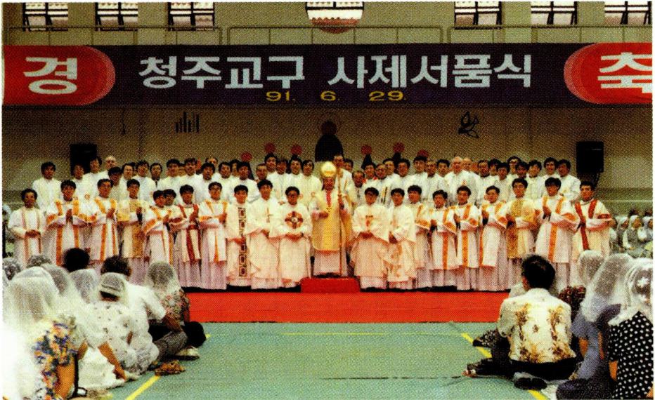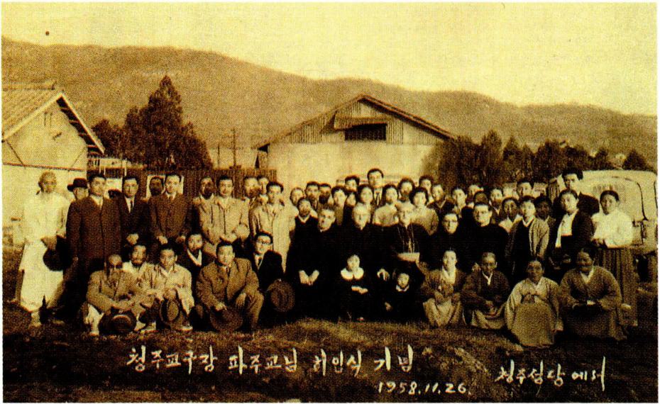 〔청주 대목구 설정과 교구 승격〕 충청북도 감목 대리구는 1958년 6월 23일 청주 대목구로 설정되었다. 이어 7월 4일 감목 대리 파디 신부가 초대 대목구장으로 임명되어 9월 16일 미국에서 주교 축성식을 갖고 입국한 뒤 다음해 1월 26일 착좌식을 가졌다. 당시 청주 대목구의 교세는 15개 본당에 성직자 29명, 신자수 18,600명이었다. 이후 파디 주교는 1958년에 괴산 본당을, 다음해에 주덕 본당과 청산 본당을, 1960년에 오송 본당과 지곡(현 지현동) 본당을 차례로 설립하였다. 한편 내덕동 본당에서는 1960년 기존 성당 인근의 부지를 매입하여 8월 22일에 주교좌 성당 정초식을 가졌고, 1961년 10월에는 동 · 서양 건축 양식을 혼합한 272평의 성당을 완공한 뒤 파디 주교의 집전 아래 '성가정' 을 주보로 봉헌식을 가졌다. 같은 해 1월 5일 파디 주교는 한국 최초로 성 빈천시오 아 바오로회의 활동을 도입하여 교현동 본당에 성 요셉 협의회를 설립하였는데, 이와 같은 협의회가 1962년 5월까지 7개로 확대되면서 다음해 4월에는 청주 대목구 중앙 이사회의 발족을 보게 되었다.