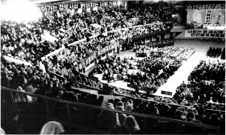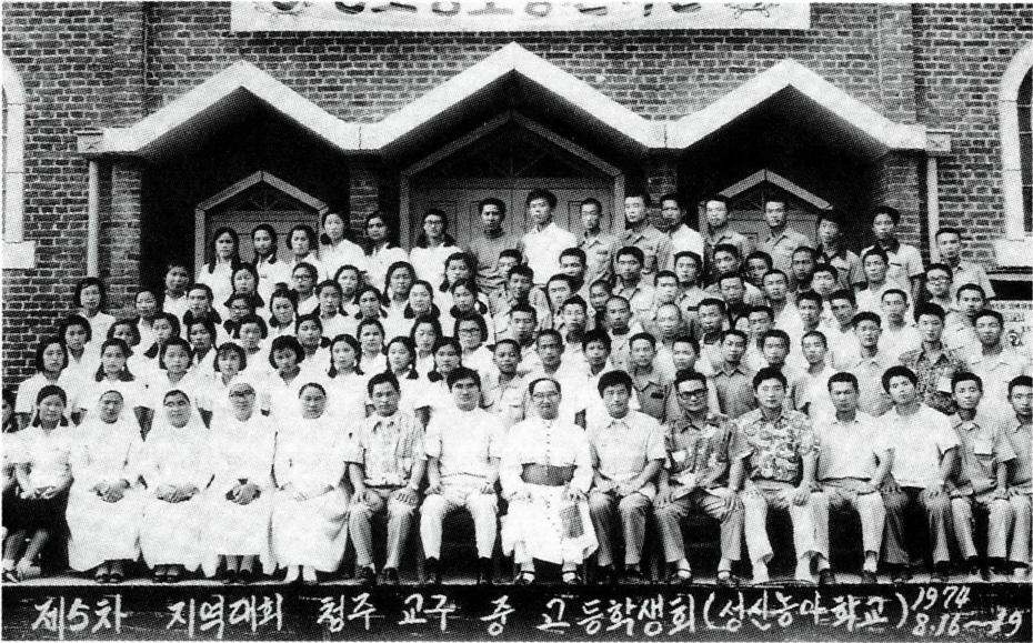 〔교구의 성장과 현재〕 청주교구에서는 정진석 주교 착좌 이후인 1971년 9월 목행동 본당을 설립하였으며, 12월에는 꾸르실료 운동을 교구에 도입하였다. 이어 1974년 9월에 사직동 본당이 설립되었고, 1976년 가톨릭 회관 축복식을 가졌으며, 같은 해 9월 12일에는 오웅진(吳雄鎮, 요한) 신부에 의해 '꽃동네' (음성군 맹동면 인곡리 소재)가 설립되어 사랑의 집 축복식을 가졌다. 또 1977년 1월 16일에는 교구 평신도 사도직 협의회가 창설됨으로써 평신도 사도직 활동이 활성화되는 계기를 마련하였고, 7월 30일에는 가톨릭 농민회 충북 지부 연합회가 조직되었다. 진천 본당에 재임하던 장봉훈(張奉勳) 신부가 한국 순교 복자 수녀회의 김우분(막달레나) 수녀를 백곡에 파견하여 배티 성지의 성역화 사업을 시작한 것도 이 무렵이었다.