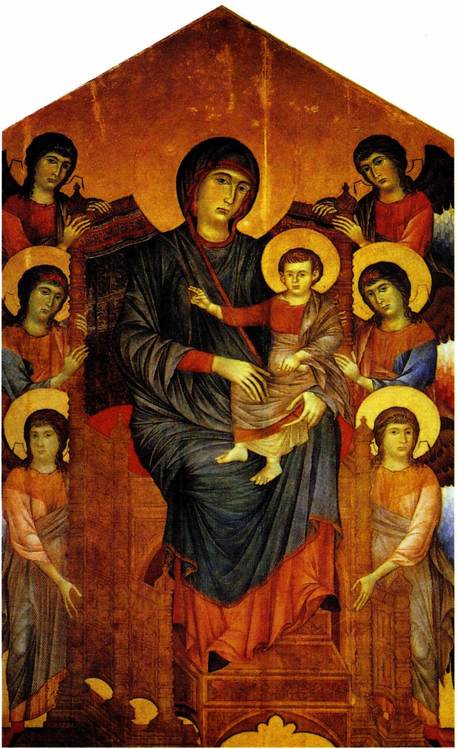 현재 우피치 미술관에 있는 385 X 223cm의 거대한 <성모자> 패널화는 원래 피렌체의 산타 트리니타(Santa Tri-nita) 성당의 주 제단화였으며, 1993년에 복원되었다. 도상적으로 마에스타(Maesta)라고 불리는 이 주제는 하늘의 여왕으로서 성모가 옥좌에 앉아 있는 것으로 중세에 흔히 볼 수 있었다. 천사에 둘러싸여 옥좌에 앉아 있는 성모자 아래에 있는 구약성서의 네 인물-왼쪽부터 예레미야, 아브라함, 다윗, 이사야-은 그리스도 왕국을 상징한다. 이 <성모자> 패널화는 두초(Duccio di Buo-ninsegna, 1255~1318)의 <루철라이의 성모>(Rucellai Ma-donna, 1285)와 구성상 매우 유사하며, 여전히 비잔틴 전통의 특징을 드러낸다. 그러나 고개를 위로 한 화면 하단 가장자리의 두 예언자, 얼굴이 살짝 측면의 형태로 그려진 천사들, 포개어 놓은 듯한 인물과 옥좌 하단의 오목한 공간 표현은 화면에 깊이감을 준다. 특히 건축적으로 표현한 옥좌는 공간 구조를 탄탄하게 하며 3차원적 효과를 만드는 반면, 화면의 가장자리를 압축해 놓은 듯 보이게 하면서 두 인물을 받쳐 준다. 이 작품은 생동감과 연극적인 인물 표현에 능숙한 치마부에의 특징을 보여 주는 대표작이다.