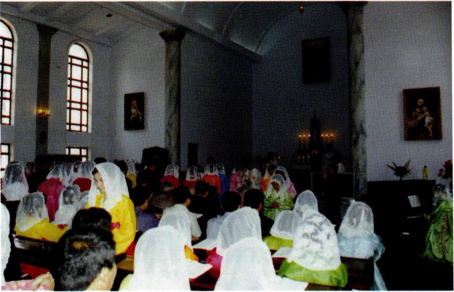 ▲ 신천 국수 공장 기계 축복식(2002. 4. 황해남도, 왼쪽)과 장충 성당 외관.