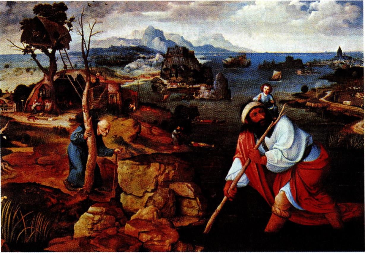 〔전 설〕 크리스토포로의 생애나 죽음에 대해서 확실하게 알려진 것은 거의 없다. 다만 《로마 순교록》(Marty- rologium Romanum)에 따르면, 그는 데치우스 황제(249~251) 시기에 리치아(Lycia)에서 순교하였는데 쇠 몽둥이로 맞아 육체가 약해진 상태에서 화형을 당하였지만, 그리스도의 도움으로 보호를 받아 죽지 않았고 수차례 화 살을 맞아도 끄떡없자 결국에는 참수되었다고 한다. 그에 대해서는 다음과 같은 전설이 전해진다. 가나안 혹은 아랍의 왕비가 성모 마리아에게 기도를 드려 아들을 얻었다. 이교도인 왕은 이 아들에게 오페루스(Offe-mus)라는 이름을 지어 주고 아폴로(Apollo) 신에게 봉헌하였다. 기골이 장대하고 힘이 센 청년으로 자라난 오페루스는 가장 힘이 세고 용감한 사람에게만 봉사하기로 결심하였다. 그는 처음에는 용감한 왕과 악마에게 자신을 의탁하였지만, 둘 다 용기가 없었다. 왕은 악마라는 이름만 들어도 무서워하였고, 악마는 길거리에 있는 십자가를 두려워하였다. 오페루스는 다시 새로운 주군을 찾았지만 찾을 수 없었다. 그러다가 마침내 한 은수자를 만났는데, 그는 그리스도에게 충성을 바치라고 권고하면서 신앙을 가르치고 세례를 주었다. 이렇게 해서 오페루스는 크리스토포로라는 새 이름으로 불리게 되었다. 그는 하느님을 위해서, 사람들이 물살이 사나운 냇물을 무사히 건널 수 있도록 도와 주는 일을 기꺼이 맡기로 하였다. 어느 날 한 아이를 어깨에 얹고 냇물을 건너는데, 그 아이의 무게가 점점 무거워지더니 결국은 온 세상을 어깨에 짊어진 것만 같았다. 그 아이는 스스로 세상의 창조주이며 구세주임을 알려 주었다. 그리고 자신의 말을 증명하기 위해 크리스토포로에게 자신의 막대기를 땅에 꽂아 보라고 하였다. 다음날 아침 종려나무로 자라난 그 막대기에는 열매가 달려 있었고, 이 기적은 많은 사람들을 회개시켰다. 이에 화가 난 리치아의 왕은 그를 감옥에 가두고 온갖 고문을 가한 뒤에 참수하였다. 그런데 크리스토포로를 참수할 때 튄 피 한 방울로 자신의 병이 낫자, 마침내 왕은 그리스도교로 개종하였다고 한다.