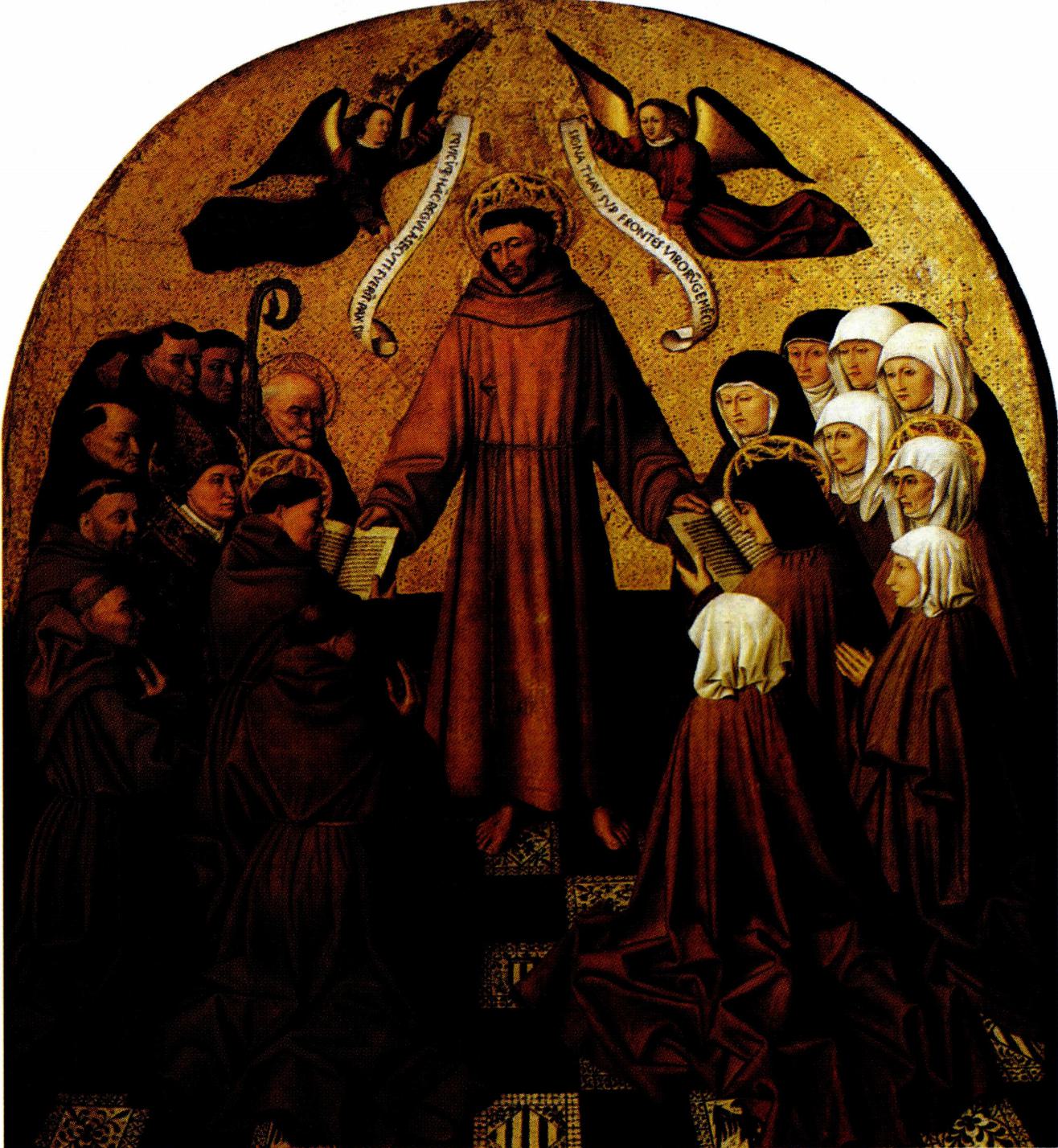 프란치스코회의 여러 형제 자매들에게 인준받은 수도 규칙을 주는 프란치스코 성인.