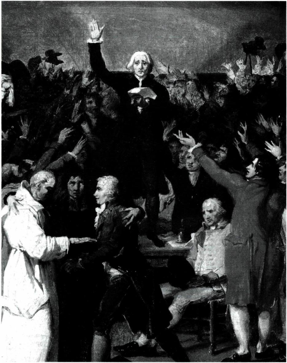〔부르주아지 혁명(1789. 5~1792. 8)〕 입헌 군주제의 등장 : 1789년 5월 5일, 루이 16세가 참석한 가운데 베르사유(Versailles)에서 삼부회가 개최되었다. 각 신분별로 제출한 진정서의 내용을 살펴보면 절대주의 체제를 반대한다는 점에서는 의견이 일치되었지만, 특권과 권리의 평등에 관련된 문제들에 대해서는 확연한 차이가 드러나 고 있었다. 특히 삼부회의 운영과 표결 방식을 둘러싼 특권 계급과 제3 신분 대표들의 치열한 갈등과 충돌이 전개되었는데, 그 과정에서 제3 신분 대표들은 귀족에게 반감을 가진 성직자 계층의 지지를 확보하는 데 성공하였다. 제3 신분 대표들은 자신들이 '국민의 100분의 96'을 대표한다고 주장하면서 6월 17일 '국민 의회' (Assemblée Nationale Constiuante)를 선포하고, 자신들의 동의 없이 어떠한 세금도 징수할 수 없다고 결정하였다. 6월 20 일에 국왕이 회의장을 폐쇄하라는 명령을 내리자, 제3신분 대표들은 테니스 코트에 모여 헌법이 제정되어 확고한 토대 위에 자리를 잡을 때까지 결코 해산하지 않을 것을 서약하였다. 국왕은 이 서약을 파기하고 별도의 회합을 개최하라고 명령하였지만 제3 신분이 이에 불복하고 파리와 베르사유 주민들도 그들에게 동조하자, 어쩔수 없이 국왕은 머릿수로 표결할 것을 명하였다.