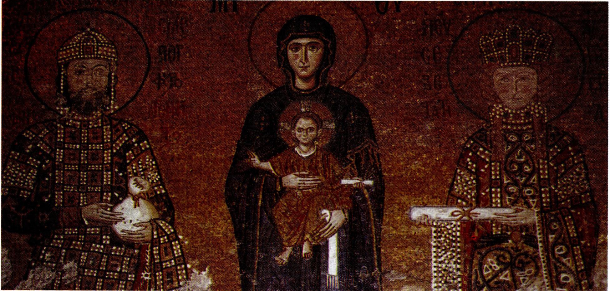 한편 황제 요한 2세(1118~1143)와 성모자, 황후 이레네(Irene)를 나란히 묘사하고 황태자인 알렉시오를 따로 그린 12세기의 모자이크도 일품이다. 황제와 헝가리의 왕 라디슬라오(Ladislaus, 1077~1095)의 딸인 이레네 황후는 둘 다 신심이 깊었고 선정을 베풀었다고 한다. 성당의 전실(前室) 옆문으로 나오다가 뒤돌아보면 박공에 매우 아름다운 10세기 모자이크가 있는데, 여기에서 황제 유스티니아누스 1세는 하기아 소피아 성당의 모형을 들고 있고, 가운데 성모 마리아는 예수 아기를 안고 어좌에 앉아 있으며, 황제 콘스탄티누스 1세(306~337)는 콘스탄티노플의 모형을 들고 있다. (→ 가톨릭 건축 ; 동방 이교 ; 체룰라리우스, 미카엘 ; 콘스탄티노플 ; 콘스탄티노플 공의회)