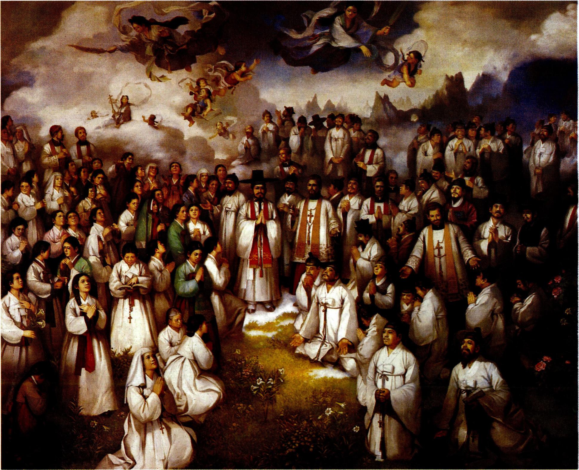 한국 천주교회 103위 성인의 총칭. 축일은 9월 20일. 축일의 명칭은 '성 김대건 안드레아와 성 정하상 바오로 와 동료 순교자 대축일' . 103위 성인 중 기해 · 병오박해 (己亥 · 丙午迫害) 순교자 79명은 1925년 7월 5일에, 병 인박해(丙寅迫害) 순교자 24명은 1968년 10월 6일에 시복되었으며, 한국 천주교회 창설 200주년을 기해 방한 한 교황 요한 바오로 2세(1978~2005)에 의해 1984년 5 월 6일 모두 시성되었다. 103위에 포함되어 있는 프랑스 의 파리 외방전교회 출신 10명의 선교사(주교 3명, 신부 7 명)들 또한 한국 선교사로서 한국인들의 영혼 구원을 위 해 목숨을 바쳤으므로 한국 교회에 속하는 성인들이다. 〔순교 시기 · 형식 · 장소] 한국 성인 103명을 순교 시 기별로 구분해 보면 1839년 기해박해 때의 순교자가 70 명, 1846년 병오박해 때의 순교자가 9명, 1866년 병인 박해 때의 순교자가 24명이다. 기해박해 순교자는 순교 순서대로 이호영(李, 베드 로), 정국보(T, 프로타시오), 김아기(金阿只, 아가타), 박아기(朴阿只, 안나), 이조이(李, 아가타), 김업이(企業 伊, 막달레나), 이광헌(李光獻, 아우구스티노), 한아기 (韓阿只, 바르바라), 박희순(朴喜順, 루치아), 남명혁(南 明赫, 다미아노), 권득인(權得仁, 베드로), 장성집(張, 요셉), 김(金, 바르바라), 이(李, 바르바라), 김노사(金 老沙, 로사), 김성임(金成任, 마르타), 이매임(李梅任, 데레사), 김장금(金長金, 안나), 이광렬(李光烈, 요한) , 이영희(李英喜, 막달레나), 김누시아(金累時阿, 루치 아), 원귀임(元貴任, 마리아), 박큰아기(朴大阿只, 마리 아), 권희(權喜, 바르바라) 박후재(朴厚載, 요한) 이정 희(李貞喜, 바르바라), 이연희(李連熙, 마리아), 김효주 (金孝珠, 아네스), 최경환(崔京煥, 프란치스코), 앵베르 (L.-J.-M. Imbert, 范世亨, 라우렌시오) 주교, 모방(P.P. Maubant, 羅伯多祿, 베드로) 신부, 샤스탕(J.H. Chastan, 鄭牙各伯, 야고보) 신부, 정하상(丁夏祥, 바오로), , 유진 길(劉進吉, 아우구스티노) 허계임(許季任, 막달레나) , 남이관(南履灌, 세바스티아노), 김유리대(金琉璃代, 율 리에타), 전경협(全敬俠, 아가타), 조신철(趙信喆, 가를 로), 김제준(金濟俊, 이냐시오), 박봉손(朴鳳孫, 막달레 나), 홍금주(洪今珠, 페르페투아), 김효임(金孝任, 골롬 바), 김(金, 루치아), 이(李, 가타리나), 조(趙, 막달레 나), 유대철(劉大喆, 베드로), 유조이(柳, 체칠리아), 최 창흡(崔昌洽, 베드로), 조증이(趙曾伊, 바르바라), 한영 이(韓榮伊, 막달레나), 현경련(玄敬連, 베네딕다), 정정 혜(丁情惠, 엘리사벳), 고순이(高順伊, 바르바라), 이영 덕(李榮德, 막달레나), 김(金, 데레사), 이(李, 아가타), 민극가(閔克可, 스테파노), 정화경(鄭, 안드레아), 허임 (許, 바오로), 박종원(朴宗源, 아우구스티노), 홍병주(洪 秉周, 베드로), 손소벽(孫小碧, 막달레나), 이경이(李璟 伊, 아가타), 이인덕(李仁德, 마리아), 권진이(權珍伊, 아 가타), , 홍영주(洪永周, 바오로), 이문우(李文祐, 요한) 최영이(崔榮伊, 바르바라), 김성우(金星禹, 안토니오) 등 이다. 이들 중에는 1839년을 전후하여, 즉 1838년이나 1840~1841년에 순교한 이들도 있으나, 모두 포함하여 '기해박해 순교자' 라고 한다. 병오박해 순교자는 순교 순서대로 김대건(金大建, 안드레아) 신부를 비롯하여 현석문(玄錫文, 가롤로), 남경 문(南景文, 베드로), 한이형(韓履亨, 라우렌시오), 우술 임(禹述任, 수산나), 임치백(林致百, 요셉), 김임이(金任 伊, 데레사), 이간난(李干蘭, 아가타), 정철염(鄭鐵艷, 가타리나) 등이다. 병인박해 순교자는 순교 순서대로 유정률(劉正律, 베드로), 베르뇌(S.F. Berneux, 張敬一, 시메온) 주교, 브르 트니에르(S-M-A-A-J. Ranfer de Bretenières, 白, 유스토) 신 부, 도리(P.H. Dorie, 金, 베드로) 신부, 볼리외(B.-L.Beaulieu, 徐沒禮, 베르나르도) 신부, 남종삼(南鍾三, 요 한), 전장운(全長雲, 요한), 최형(崔炯, 베드로), 정의배 (丁義培, 마르코), 우세영(禹世英, 알렉시오), 다블뤼 (M.N.A. Daveluy, 安敦伊, 안토니오) 주교, 위앵(M.L.Huin, 閔, 마르티노 루가) 신부, 오메트르(P. Aumaitre, 吳, 베드로) 신부, 장주기(張周基, 요셉), 황석두(黃錫 과, 루가), 손자선(孫, 토마스), 정문호(鄭, 바르톨로메 오), 조화서(趙, 베드로), 손선지(孫, 베드로), 이명서 (李, 베드로), 한재권(韓, 요셉), 정원지(鄭, 베드로), 조 윤호(趙, 요셉), 이윤일(李尹一, 요한) 등이다. 순교 형식별로 살펴보면 참수 순교자가 60명으로 가장 많고, 군문 효수가 16명, 교수가 15명, 옥사가 11명, 장사가 1명이다. 순교지별로는 서소문 밖 네거리가 44 명으로 가장 많고, 다음으로 새남터가 11명, 당고개가 9 명, 전주 숲정이와 서천교가 7명, 충청도의 수영(水營) 이 있던 보령(保寧)의 갈매못이 5명, 평양 · 대구 · 공주 가 각각 1명이며, 나머지 24명은 서울에서 교수되거나 옥사하였다. [성별 · 신분 · 직업과 신앙 경력] 성인들의 성별은 남 자가 56명(선교사 10명 포함)이고 여자는 47명이다. 연령 상으로는 13세의 유대철이 최연소자이고 78세의 유조이 가 최고령자이며, 40대가 30명으로 제일 많고, 50대가 23명, 30대가 20명, 20대가 19명, 10대가 4명, 60대가 4명, 70대가 3명이다. 출신 지역별로는 서울이 27명으 로 가장 많고, 다음으로 경기도가 21명, 