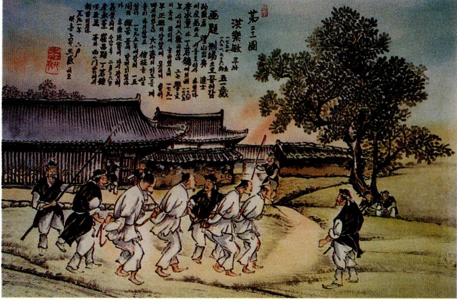 이승훈, 최창현, 정약종, 홍교만 등과 함께 형장으로 끌려 가는 홍낙민.