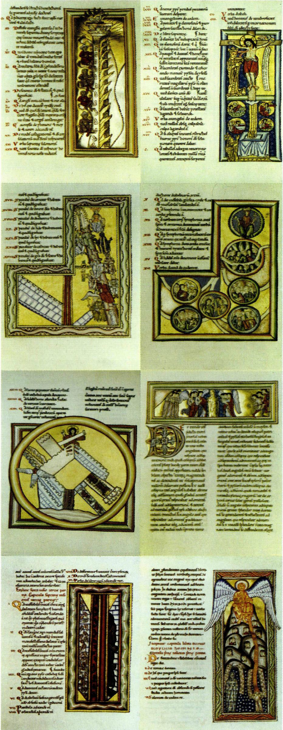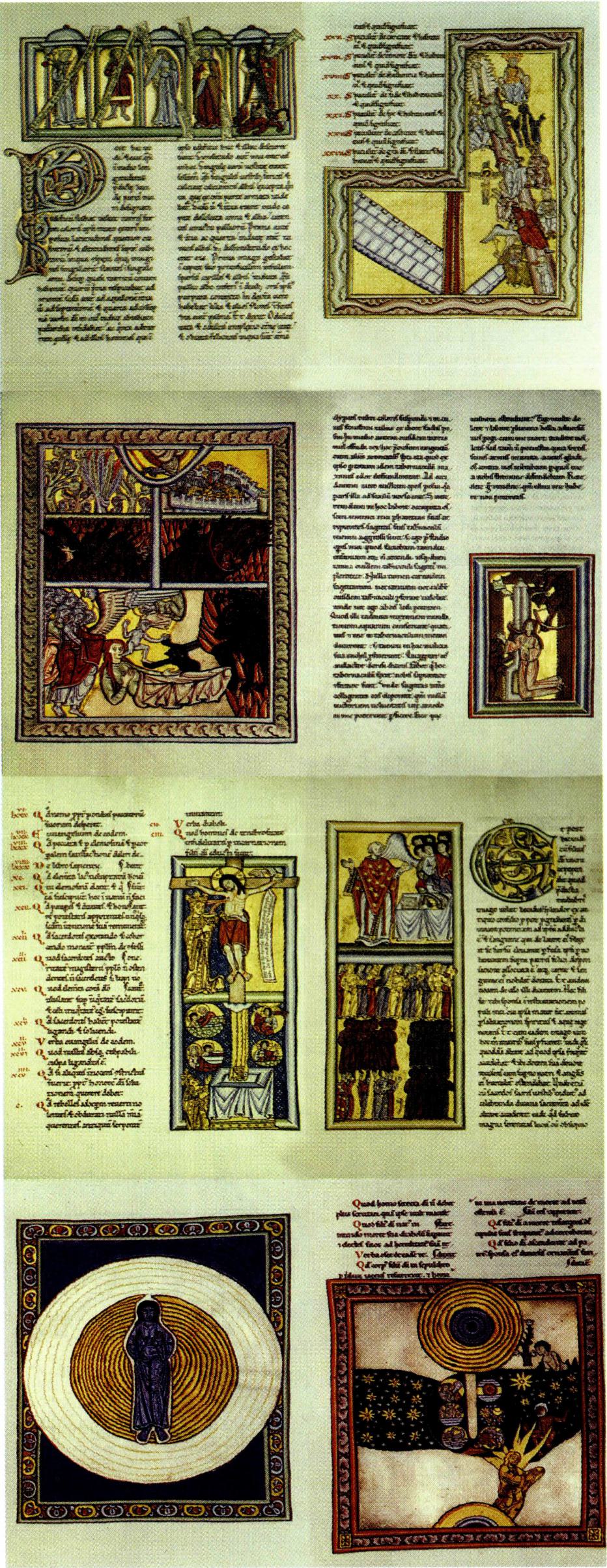 주요 저서 : 《쉬비아스》(1411~1151)에는 힐데가르트의 26가지 신비적 환시를 담고 있으며, 세 권으로 나누어져 있다. 또한 그녀의 환시를 그려 채색한 35개의 그림과 환시에 관한 주석, 계속되는 연작물을 위한 배경 연구가 수록되어 있다. 그녀는 이 책의 서문에서 자신이 "하느님이 원하는 바처럼 누구나 갈 수 있는 장소에서, 그리고 깨어 있고 의식이 있는 상태, 투명한 이성의 상태에서 내적인 인간의 눈과 귀로" 환시를 받았다고 분명히 밝히고 있다. 본래 이 책에는 표제 없이 내용을 총괄하는 서문만 있었는데, 1928년 독일어 번역본에서는 각 환시와 책에 각각의 내용을 요약해서 제목을 달았다. 이 책은 교리 교육용처럼 전달하는 내용들이 하나의 그림과 그 그림에 대한 설명으로 구성되어 있다. 《책임 있는 인간》(1158~1163)은 삶과 관습에 대해 총 6장으로 구성된 윤리서이다. 여기에는 각각 35종류의 덕과 악덕들이 등장하여 서로 말하고 싸우는 놀라운 극(劇)이 전개된다. 인간이 세상을 형성하는 데 함께하는 것은 언제나 순간일 뿐이다. 그렇기에 무엇보다도 자신이 처한 상황, 그 순간의 결정 오늘의 그리고 현재의 결정이 중요하다. 인간은 매순간 악덕과 덕, 창조의 진보 발전과 파괴에서 어느 쪽을 향할 것인지 결정해야 한다고 가르치는 점이 이 책의 역동성을 보여 준다. 음악극 <성덕의 열>(Orde virtutum)도 "책임 있는 인간"이라는 내용을 담고 있다. 《세계와 인간》(1165~1174)은 힐데가르트의 우주론이 담긴 책으로, 《하느님의 창조 사업》(De operatione Dei)이라고도 한다. 이 책은 세계와 인간 안에 이루어지는 하느님의 작용에 대한 열 개의 환시에 대한 내용으로, 첫 번째 부분에서는 우주와 결합된 존재(Eingebundensein)로서의 인간과 소우주로서 존재하는 인간에 대해 서술한다. 인간은 창조적인 능력을 지니고 있으며 따라서 우주와의 관계, 창조와의 관계에 책임이 있다. 두 번째 부분에서는 인간의 책임감에 대해 다루며, 세 번째 부분에서는 구원사를 다룬다. 우주 인간의 상(像)과 우주에 영향을 주는 힘들이 인간과 창조의 상호 의존 관계를 분명하게 한다.