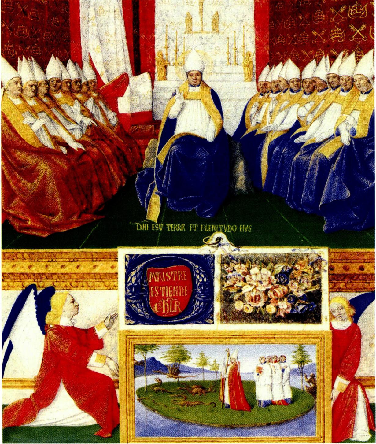 삼위 일체 논쟁 : 이에 대한 반응은 전혀 기대하지 않은 인물, 즉 336년 안치라(Ancyra)의 주교 바실리오 (Basilius, ?~363?)에게서 나타났다. 그는 358년 부활절 이전 안치라에서 12명의 주교만 참석한 교회 회의를 소집하였는데, 이들은 성부와 성자가 전혀 비슷하지 않다고 주장하는 과격한 아리우스파( '비' 유사파)에 반대하는 동시에 니체아 신앙 고백의 '동일 본성' 대신에 '유사'(類似) 개념을 새로 끌어들여 중용적인 입장을 취하였다. 이 '유사 본질파' 는 황제를 설득하는 데 성공하여 안티오키아(341)와 시르미움(351) 교회 회의의 결의를 증거로 358년 시르미움 교회 회의에서 비유사파의 지도적 인물인 아에티우스(Aetius, ?~365)와 에우노미우스(Eunomius, 325?~394)를 단죄하였으며, 힐라리오에게 유사 본질파 신학을 이해할 수 있는 기회를 주었다. 힐라리오는 《교회 회의론》(De synodis)에서 갈리아 지방의 주교들에게 유사 본질파 신학을 니체아 신앙 고백의 정통적인 해석으로, 아울러 동방과 서방의 일치 정식으로 제안하였다. 그는 이 제안에서 동방의 니체아 신앙 고백을 통찰하도록 하였을 뿐만 아니라, 359년에 개최하기로 계획한 제국 교회 회의를 준비하며 서방의 반아리우스파였던 니체아파와 동방의 반아리우스파인 반니체아파 사이에 일치된 공동 전선을 구축하고, 이를 통해 동방과 서방의 분열을 극복하고자 하였다. 그러나 이후에 일련의 사건들이 일어나 그의 이러한 노력은 무산되고 말았다. 황제 콘스탄티우스 2세는 359년 서방에서는 리미니 교회 회의를, 동방에서는 셀레우치아 교회 회의를 동시에 개최하여 성자와 성부는 "성서 말씀에 따라 비슷하다" (유사파)라는 모호한 결론을 내려 버린 것이다. 힐라리오는 《콘스탄티우스 논박서》(Contra Constantium Augustum Liber)에서 황제의 이중 교회 회의 조치에 대해 신랄하게 논박하고, 그를 네로(54~68)와 데치우스(249~251) 황제보다 더 나쁜 독재자라고 비난하였다. 이 작품은 황제가 서거한 후에 서방 주교들에게 전달되었다.