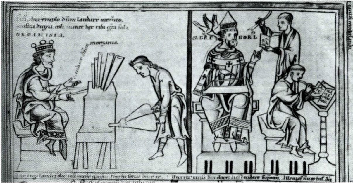 로마 가톨릭 교회에서 미사를 비롯한 칠성사와 성무 일도 등 모든 경신 행위에 사용되는 고유 성가. 교황 그 레고리오 1세(Gregorius Magnus, 590~604)의 업적에 따라 그의 이름에서 유래되었다. 그는 당시 지역별로 산재해 있던 로마 성가, 갈리아 성가, 모자라빅 성가, 암브로시 오 성가, 베네벤토 성가 등의 초기 그리스도교 성가 중에 서 로마 성가와 갈리아 성가를 중심으로 하면서 나머지 들도 합해 전례력에 따라 정돈시킨 《안티포나리우스 천 토》(antiphonarius cento)를 집대성하였으며 전례 음악의 체 계적인 교육을 위해 노래 학교(schola cantorum)를 세우는 등 전례 음악 정착에 힘을 기울였다. 이는 로마 교황의 주도 아래 이루어진 서방 교회의 전례적 통일이었으며 8 세기 카알 대제의 정치적 영향으로 널리 전파되었다. 그 레고리오 성가는 다성 음악의 테마로 사용될 때 '칸투스 피르무스 (cantus firmus), , 또는 '주어진 선율' 이란 뜻으로 '칸투스 다투스' (cantus datus) , '평탄한 노래' 란 뜻의 칸 투스 플라누스 (cantus planus), '쪼개지는 노래' 란 뜻의 '칸투스 프락투스 '(cantus fractus) 영국에서는 다 함께 부르는 노래' 란 의미의 '코랄' (choral) 등으로도 불려진 다. 〔특 성〕 음악(musica)이 아니라 노래(cantus)로서의 기 도이다. 즉 항상 가사와 연결되어 있으며 교회 예절을 돕 는 그 가사를 더 강하게 잘 표현하기 위한 것이다. 가사 는 대부분 성서에서 택하고 특별히 시편을 많이 사용하 는데 내용은 하느님께 대한 찬미, 감사, 탄원 등이다. 구 성상으로는 8개의 선법(정격 4 + 변격 4)으로 이루어진 단성 성가이며 자연음으로 구성된 전음계의 특성을 갖고 있다. 문화적 · 역사적 측면에서 볼 때 음악사의 1천여 년 동안의 음악은 이 단성 성가를 말하며, 다성 음악을 탄생, 발전케 한 원천으로서의 큰 가치를 지니는 한편 언어의 성격에 맞게 발전되었다는 점이 주목할 만하다. 〔구 성〕 표기 : 원시적 표기에서는 가사를 운율적으로 읽기 위해 라틴어의 악센트를 도입, 필요에 따라 가사 위 에 a(altus, 높게), e(equaliter, 같게), i(inferius, 낮게), t(tenete, 천천히) 등과 같은 로마 문자를 사용하여 감정적 표현을 풍부히 하였다. 여기서 좀더 발전하여 더욱 정확한 음을 표현할 수 있는 기보법이 귀도(Guidod' Arezzo, 990~1050) 에 의해 창안되었다. 귀도는 음을 확실히 잡게 하기 위해 각 음에 고유한 이름을 붙였는데 이는 성무 일도 중 세례 자 요한 축일 저녁 기도 찬미가 "ut queant laxis" 를 따서 붙 였는데 이유는 각 단락의 첫 음이 한 음씩 상행하는 구조 를 지니고 있기 때문이다.
