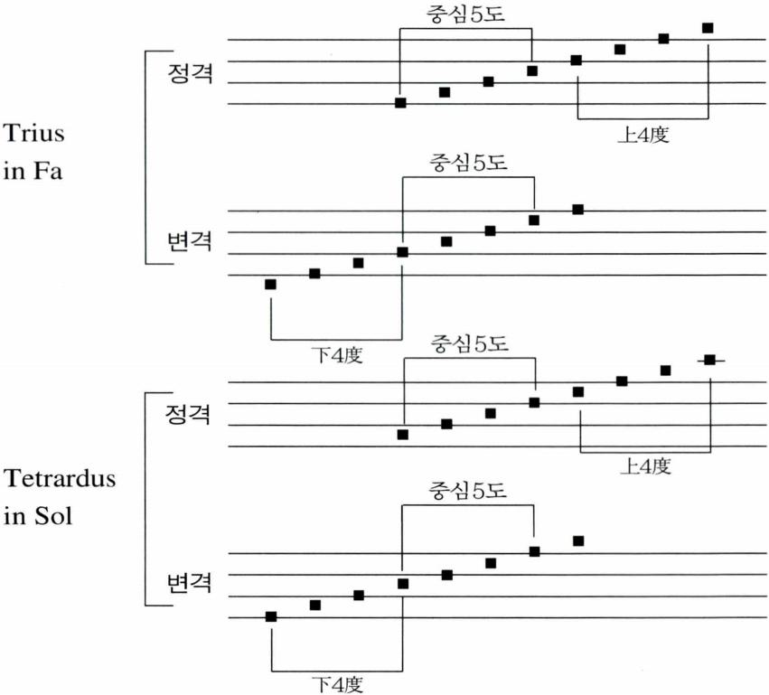 음자리표 : 모두 두 가지로 악보 첫머리에 표시하는데 '도' (Do)를 나타내는 로마자 C의 변형인 " : " 와 파(Fa) 를 나타내는 로마자 F에서 유래한 " " 로 표시한다. [형 식] 대부분의 전례 가사는 신구약 성서에서 발췌 되었으므로 자연히 산문 가사를 더 잘 전달할 수 있는 방 법이 요구되었고, 여기서 여러 형식의 성가들이 발전되 었다. 낭송(recitaio)과 시편창(psalmodia) : 미사 독서와 복 음, 성무 일도 중 독서의 기도(matutinum)에 나오는 독서 (lectio)는 쉼을 지시하는 단순한 음을 비롯하여 다양한 낭송음으로 구성된다. 또한 성금요일의 애가(lamentatio) 나 수난 시기의 독서를 위하여 더욱 특별한 음들이 만들 어졌고, 미사의 기도문과 감사송은 종지 형태를 가진 낭 송의 일반 원칙을 따랐으나 내적 종지를 두어 대구(對 句) 형태를 지닌 가사의 본질을 인정하고 있다. 이 간단 한 원칙은 시편창에도 적용되는데, 그 대구 형태는 음악 적 종지에 의해 명백하게 드러난다. 시편 구절의 둘째 행 부터는 첫째 행의 시작음을 제외한 낭송음으로 시작되므 로 두 번째 낭송에 의해 그 윤곽이 분명해진다. 교창(antiphonalis) : 두 집단이 시편 구절을 번갈아 낭 송한 후에 후렴 형태로 불려진 노래, 즉 오늘날의 후렴에 해당된다. 이 교창이 점차 발달하여 곡이 길어지면서 후 렴의 역할보다 더 독특한 성격을 띠게 되었는데 미사의 입당송과 영성체송이 이 형태이다. 새로 만들어진 가사 도 교창하였는데, 그 교창되는 선율들은 대부분 구전(口 傳)되었다. 이런 형태는 가끔 종지형을 가진 낭송음을 구성하면서 시편창 구조를 갖기도 한다. 답창(responsoriais) : 교창 형식과 같이 후렴의 일종이 지만 선창자에 의해 불려지는 것이 답창 형식의 특징이 다. 즉흥적이며 독창적 성격을 지닌 이 답창 형식은 좀더 잘 꾸며지는 경향이 있었다. 미사의 응송과 알렐루야는 답창 형식에 속하며 봉헌송은 교창 형식에서 답창 형식 으로 변화되는 과정을 거친 것으로 보인다. 호칭 기도(litania) : 가사와 선율의 동일한 응답 부분이 한 문장이나 호칭 끝에 합쳐져서 한 절을 이룬다. 도문 (禱文)의 기원은 구약의 시편과 찬가(cantcum)로 추측되 며 모든 성인의 호칭 기도(litanium omnium sanctorum)가 그 좋은 예이다.