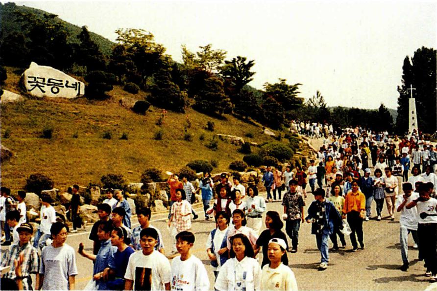 청주교구 천주교회 유지 재단 산하의 종합 사회 복지 시설. 의탁할 곳이 없는 행려자와 신체 장애자 및 병자들 에게 침식과 요양 등 각종 편의 시설을 제공하고, 세례성 사를 통해 그리스도인으로서 재활의 삶을 살아가도록 인 도하는 공동체이며 사랑의 교육장이다. 1995년 현재 충 북 음성과 경기도 가평에 각각 설립되어 있으며, 경남 거 창에도 설립을 추진 중에 있다. 설립자는 오웅진(吳雄 鎭, 사도 요한) 신부. 〔설립과 변모〕 1976년 무극 본당 신부로 부임한 오웅 진 신부가 자신의 사재 1,300원을 털어, 40년 동안 무 극천 다리 밑에 거주하면서 걸인들에게 밥을 얻어다 주 는 등 자선을 실천해 온 최귀동(베드로, 본명 경락)을 포 함한 5가구 18명의 극빈자들에게 무극 용담산 밑에 벽 돌 집(사랑의 집)을 만들어 준 것이 그 계기가 되었다. 당 시 오 신부는 "얻어먹을 수 있는 힘만 있어도 그것은 주 님의 은총" 이라는 사실을 깨닫고, 가정과 사회로부터 버 림을 받아 얻어먹을 힘조차 없이 길가나 다리 밑에서 추 위와 배고픔, 질병 등으로 아무도 모르게 죽어 가는 이들 을 돌보아 줄 사랑의 공동체를 만들 결심을 하였다. 오웅 진 신부의 이 같은 계획은 점차 교구장과 동료 사제들의 공감을 얻게 되었고, 마침내 1980년 9월 청주교구 사제 총회에서 종합 사회 복지 시설인 꽃동네를 설립하기로 의결하게 되었다. 이에 앞서 1979년 9월경부터는 자원 봉사자가 이곳을 찾아오기 시작했으며, 1981년 부활 대축일을 기해 전국 적인 회원 모집에 나섰다. 같은 해에 예수 성심 시녀회 소속의 김인기(아셀라) 수녀가 파견되었고, 1982년 5 월, 충북 음성군맹동면 인곡리 산 1의 45번지 9,807평 을 매입하였으며, 곧 이어 익명의 독지가로부터 산 2만 평을 기증받았다. 그 후 꽃동네 본동 370평을 준공하여 구원의 집, 임 종의 집, 부활의 집 등 모두 5개 동의 건물 안 에 270명의 부양 가족 을 입주시켰다. 1983 년 청주교구 사제 총회 에서 신순근 申順根, 비오) · 장봉훈(張奉勳, 가브리엘) 신부가 이사 로 임명되었고, 1984년 3월 사회 복지 시설로 인가를 받았으며, 11월 에는 서울 사무소를 개 설하고 1985년 10월에 는 정신 요양원(1,100 평), 1986년 10월에는 결핵 요양원(930평)을 준공하였다. 또 1986년 12월 27일 꽃동네를 위 해 헌신할 목적으로 자원하여 모인 봉사자들의 공동체가 청주교구장 정진석(鄭鎭奭, 니콜라오) 주교로부터 '예수 의 꽃동네 형제회 · 자매회' 라는 명칭으로 정식 수도회 창설을 인가받았으며, 1987년 1월에는 오웅진 신부가 그 동안 겸임해 온 무극 본당에서 떠나 꽃동네 지도 신부 만을 전담하게 되었다. 같은 해 10월 노인 요양원(1,200 평)을 준공하였고, 1988년 10월에는 알코올 중독자 요 양원(1,200평)과 인곡 자애병원(800평)을 준공하여 이듬 해 4월 인곡 자애병원을 개원하였고, 7월에는 경기도 가평군 하면 하판리 산 134-14번지 15,200평의 부지 에 제2의 꽃동네(가평 꽃동네)를 설립하여 수녀 1명을 파 견하였다. 이어 1990년 5월 음성에 1,000평의 심신 장 애자 요양원을 준공하였고, 1992년 9월 가평에 부랑인 시설(1,916평)을 준공하였으며, 다음해에는 같은 곳에 정신 요양원(2,200평)과 노인 요양원(2,100평)을 준공하 였다. 또 1994년 5월, 음성에 천사의 집(800평)을 준공 하였으며, 같은 해 가평에 심신 장애인 요양원(2,000평) 과 노체리안드리 자애병원(2,000평)을 건립하기 . 시작하 여 1995년 6월 준공을 목표로 현재 공사 중에 있다. 〔현황과 전망〕 1980년대 후반부터 오웅진 신부를 비 롯한 꽃동네의 봉사자들은 단순히 건물을 짓고 시설을 갖추어 행려자와 병자들을 돌보는 데 만족하지 않고, 온 국민이 함께 이웃 사랑을 실천하여 불행한 사람들이 더 이상 나오지 않게 하자는 취지에서, 자선과 애덕의 삶을 행동으로 가르쳐 주는 '사랑의 연수원' 을 건립할 계획을 세우게 되었다. 이에 1986년 '사랑의 손잡기 운동' 을 전 개하여 20만 평의 연수원 부지를 마련하고 이후 계속하 여 모금 운동을 전개한 결과, 1994년 10월 우선 4만 평 의 부지 조성 작업을 마쳤으며, 1995년 1월 현재 1만 평의 건물 중 1차로 5,000평의 건축 공사를 시작하게 되었다. 이 연수원은 "국민을 위한, 국민에 의한, 국민의 교육장"이 되는 것을 그 목표로, 행복의 집 · 가정의 집 · 국가의 집 · 인류의 집 등을 건립할 계획을 세우고 있다. 연평균 약 20만 명이 넘는 사람들이 꽃동네를 찾 아와서 이웃 사랑을 몸소 체득하고 있다는 사실을 감안 할 때, 이 연수원이 완공되면 연간 약 80~100만 명이 이곳에서 현장 교육을 받을 수 있게 될 것으로 예상된다. 꽃동네가 창립된 지 19년이 경과한 1995년 현재 음성 에는 약 2,000명의 부양 가족들과 오웅진, 정광열(鄭光 烈, 바르톨로메오) 신부를 비롯한 400명의 봉사자 · 수 도자가, 가평에는 700명의 가족들과 반영억(潘永億, 라 파엘) 신부를 비롯한 100여 명의 봉사자 · 수도자가 거 주하고 있으며, 전국과 해외에 약 62만 명의 후원 회원 이 있다. 특히 이들 후원 회원 중에는 가톨릭 신자뿐만 아니라 프로테스탄트, 불교 신자와 비종교인이 망라되어 있으며 정치인 등 사회 지도층과 각계 각층의 사람들이 다양하게 포함되어 있어, 꽃동네를 향한 범국